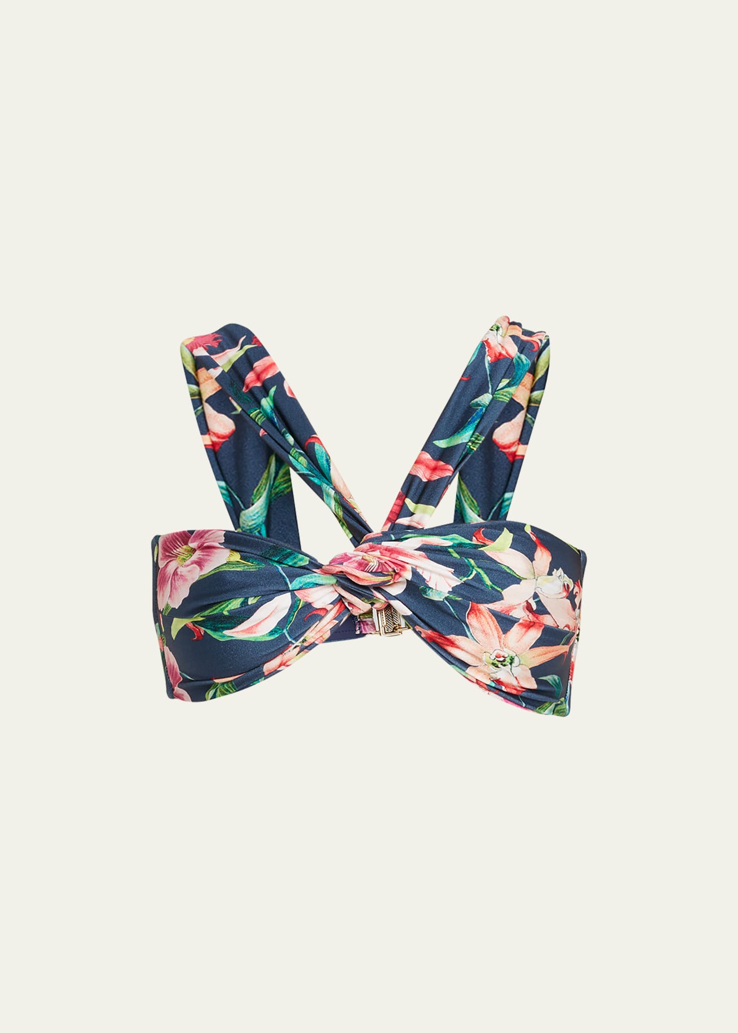 PatBO "Laelia" bikini top in a floral print features a twisted front detail High neckline Wide shoulder straps Mid-back clasps Polyamide/elastane Made in Brazil Bottoms sold separately