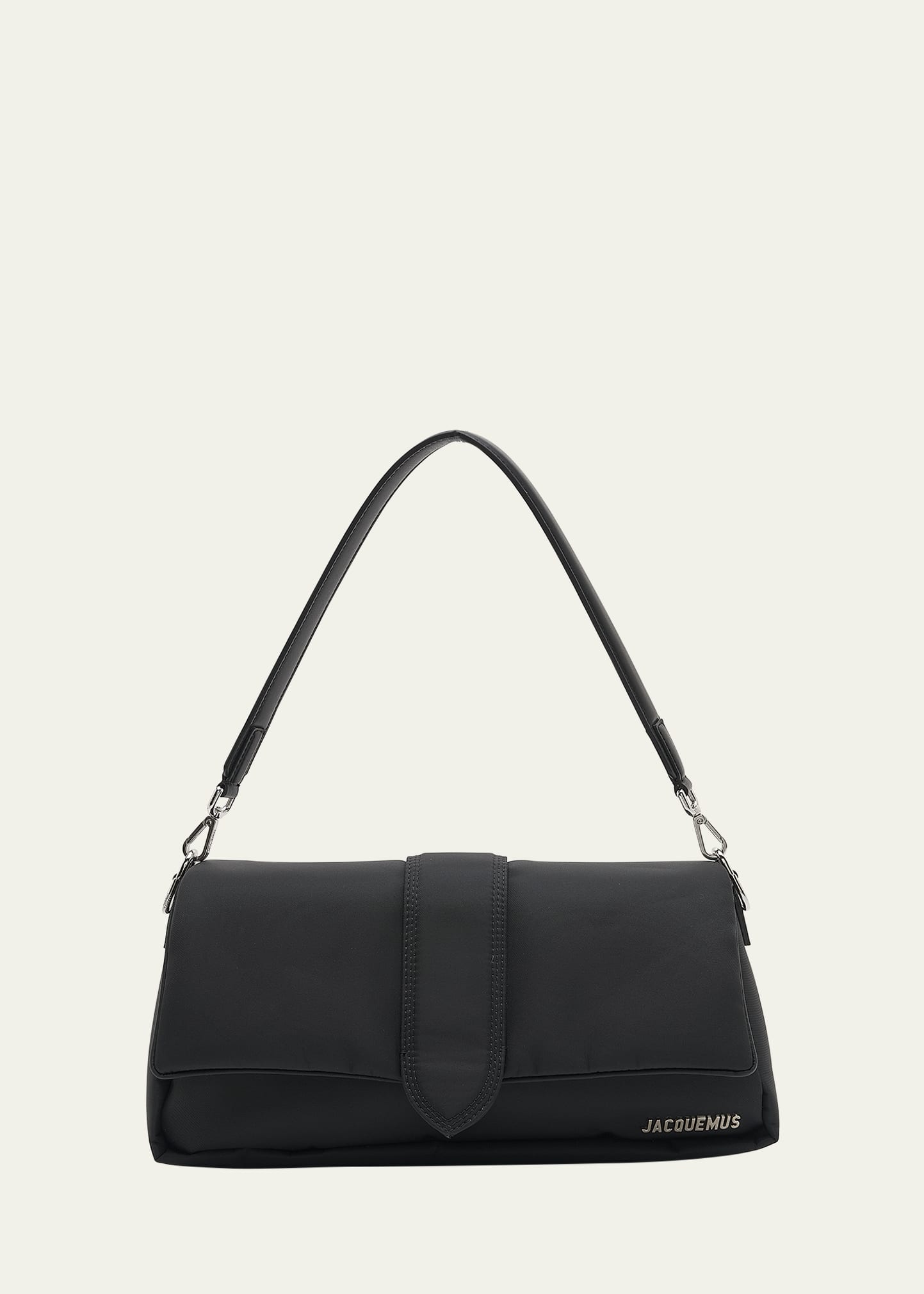 Jacquemus "Le Bambimou" nylon shoulder bag with leather trim Features gold lettering on corner Detachable shoulder strap Detachable crossbody strap Flap top with magnetic closure Interior, one slip pocket Lining: Cotton Approx. 6.3"H x 11.8"W x 2.7"D Made in Italy