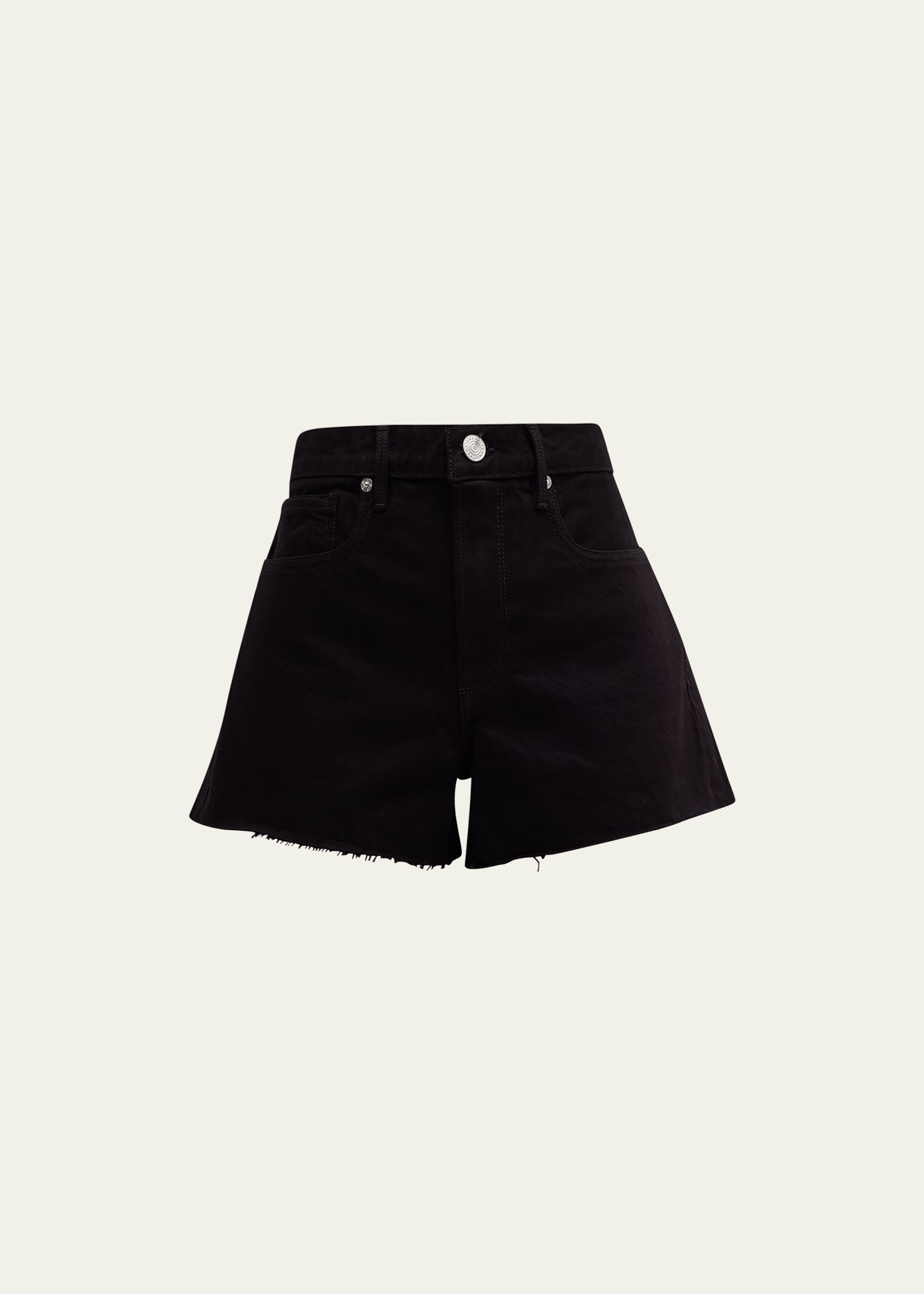 FRAME "Le Brigette" shorts with a raw hem in black denim Five-pocket style High rise Flared fit Button/zip fly; belt loops Cotton Dry clean Imported