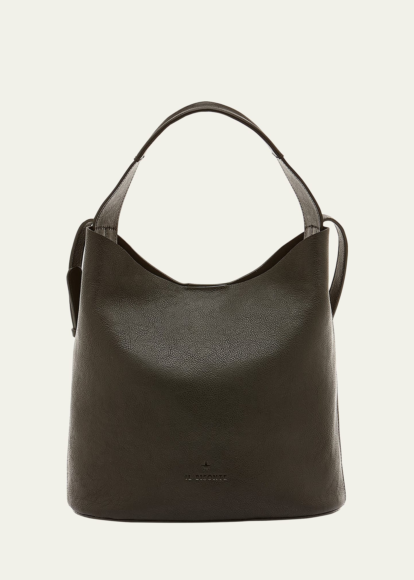 Il Bisonte "Le Laudi" bucket bag in vachetta leather Flat top handle Adjustable crossbody strap, 21.3" drop/ 47.2"L Can be worn as a top handle or crossbody bag Open top with snap closure Interior, one slip pocket Lining: Suede Approx. 11"H x 11.8"W x 5.5"D Item Weight (Lbs.): 1.5 Made in Italy