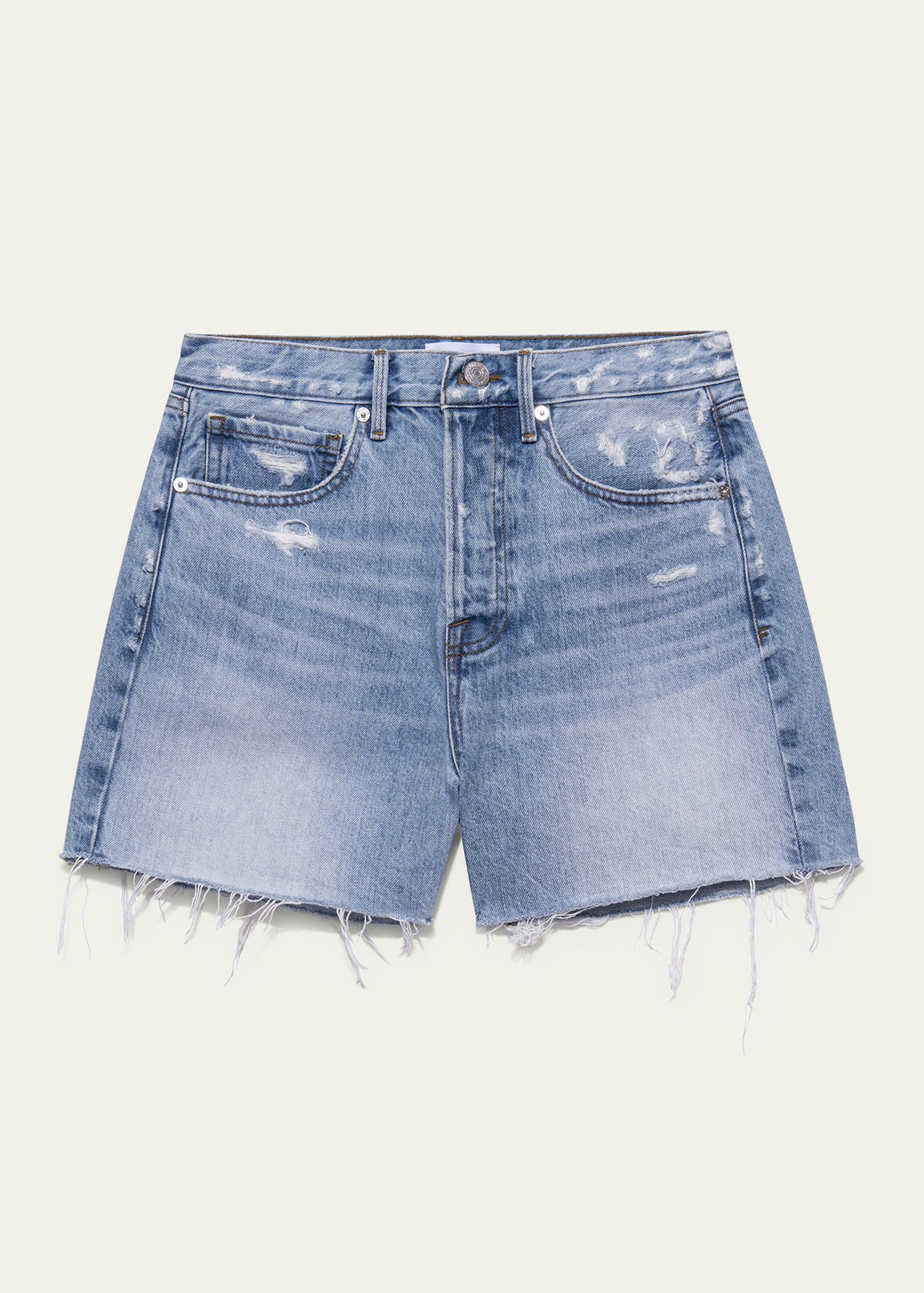 FRAME "Le Super High" distressed shorts in faded medium-wash denim Five-pocket style High rise Slim fit Button/zip fly; belt loops Cotton Imported
