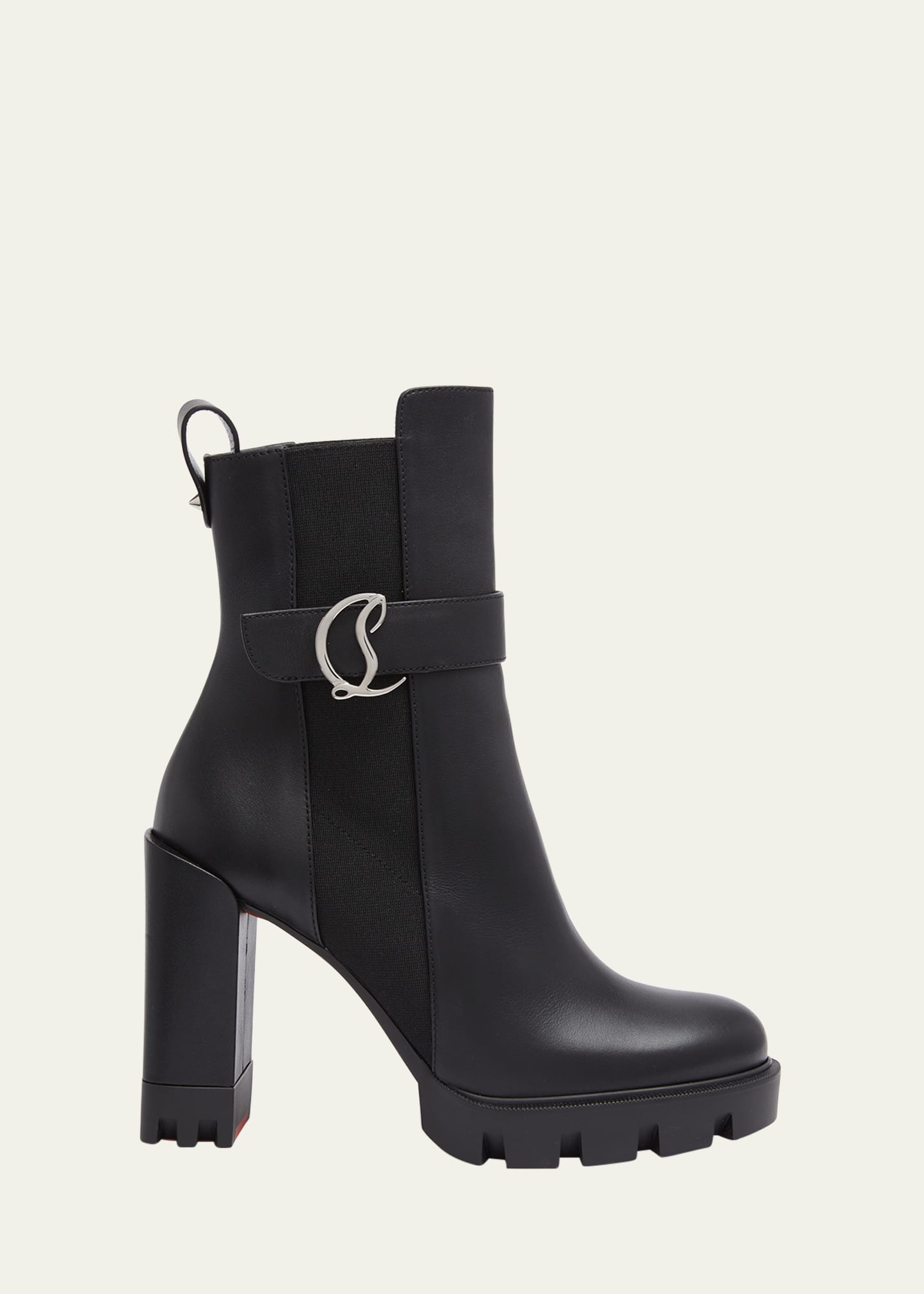 Christian Louboutin smooth calf leather chelsea boots with logo ankle buckle 4.00 in / 100 mm chunky block heel Round toe Gored sides Pull-on style Signature Louboutin red leather lug outsole Made in Italy