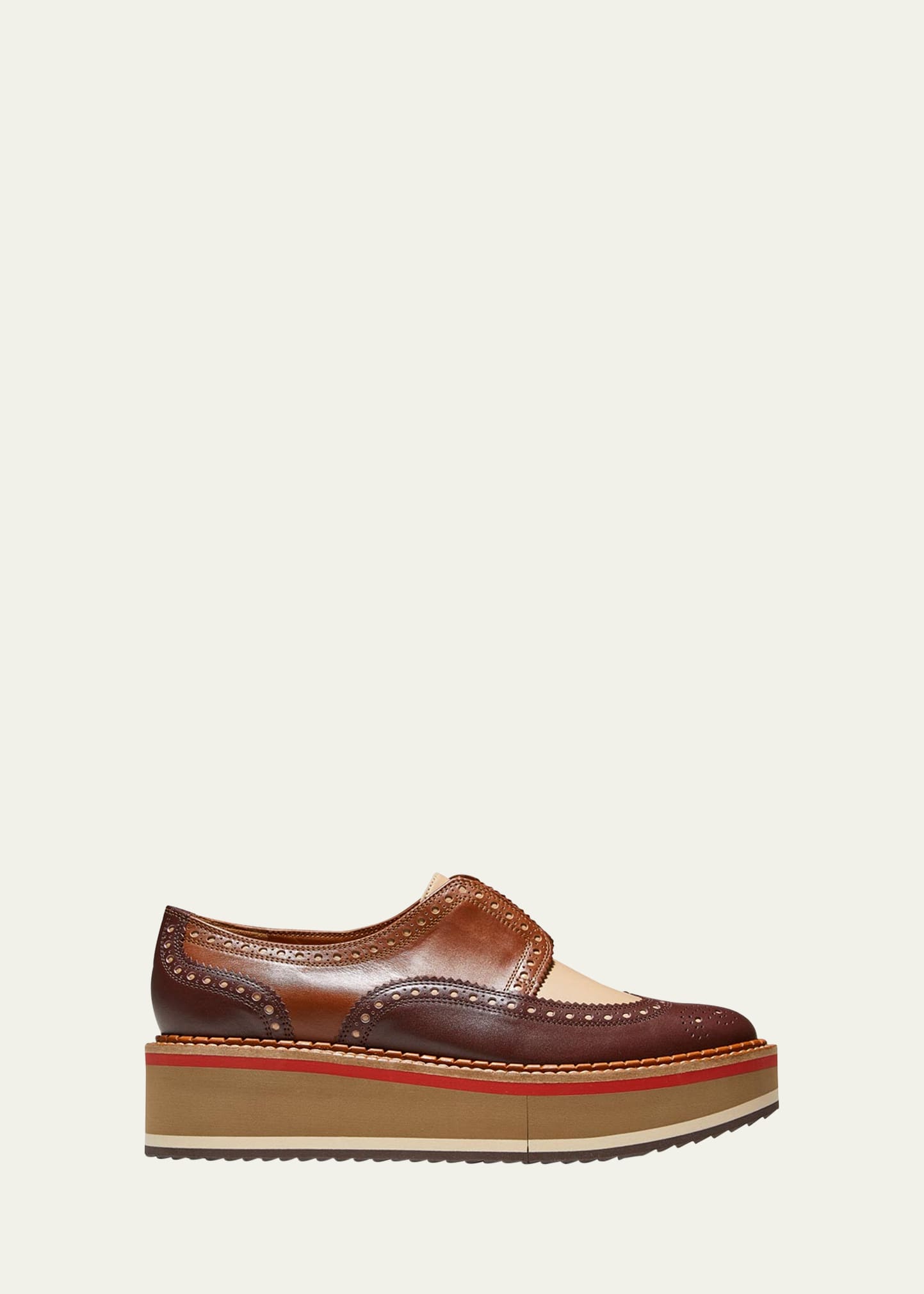 Clergerie Paris oxford loafers in perforated colorblock leather 1.75 in / 45 mm platform heel; 1.50 in / 40 mm platform Almond toe Elastic band vamp Slip-on style Rubber outsole Lining: Goat leather Made in France