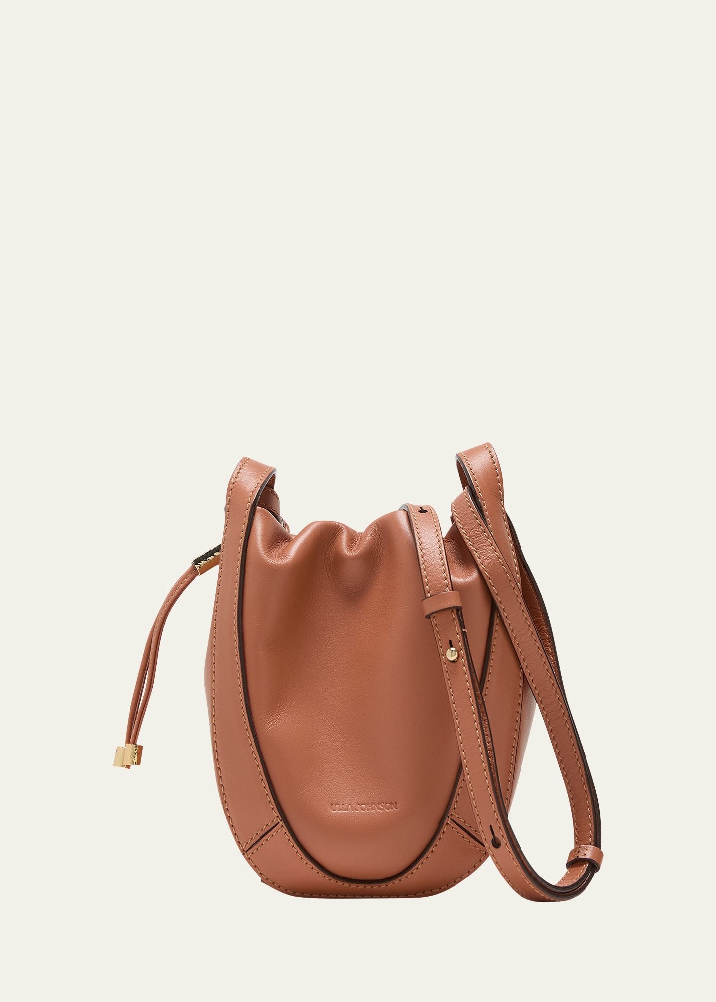 Ulla Johnson "Lee" bucket bag in calf leather Stone top handle Adjustable crossbody strap Can be worn as a top handle or crossbody bag Drawstring closure Interior, one card slot Approx. 6"H x 5"W x 3"D Made in Italy