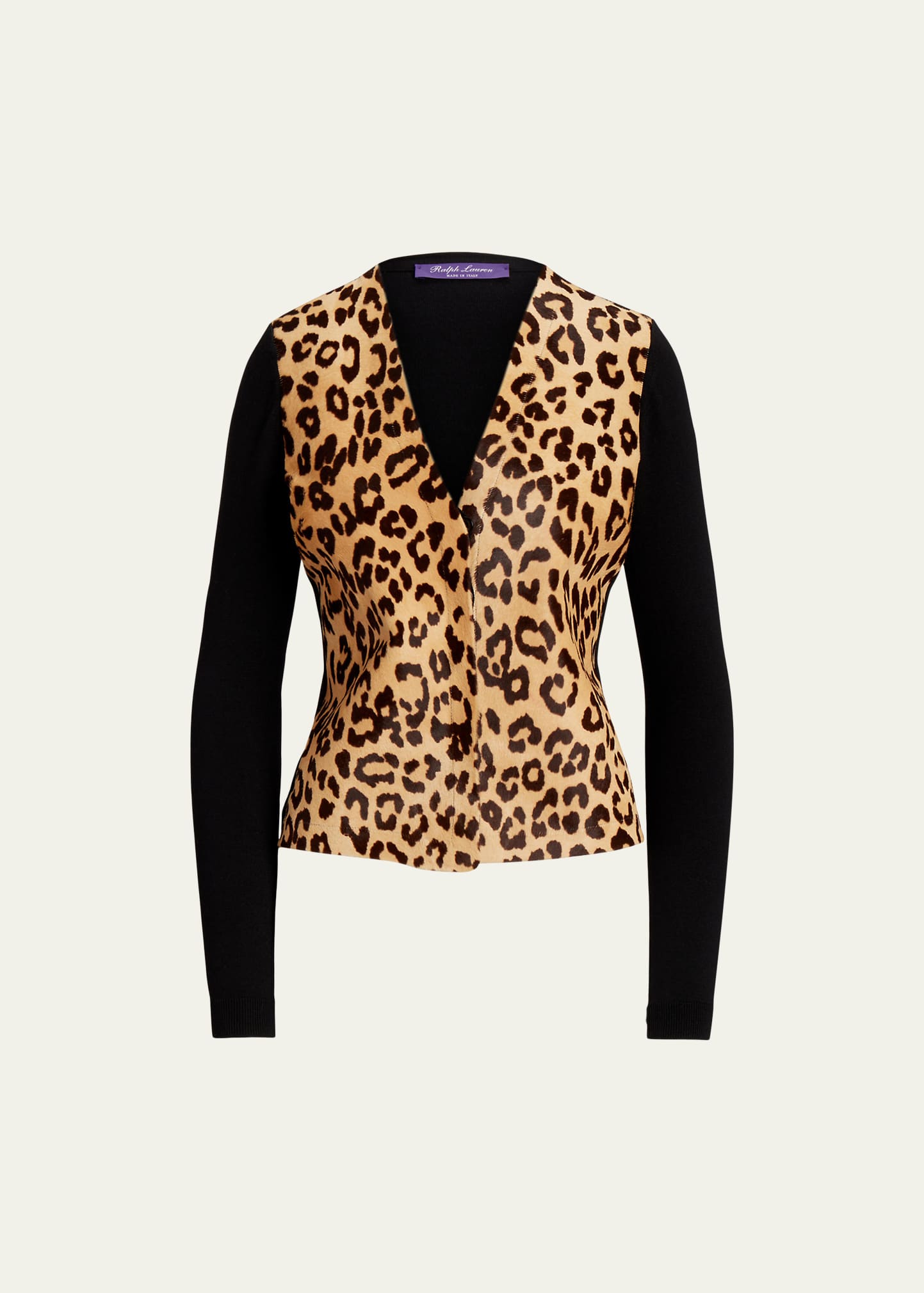 Ralph Lauren Collection button-front cardigan features a leopard printed styling at front V-neckline Concealed snap button-front Long sleeves Hip length Semi-fitted Wool Lining: Cupro Made in Italy
