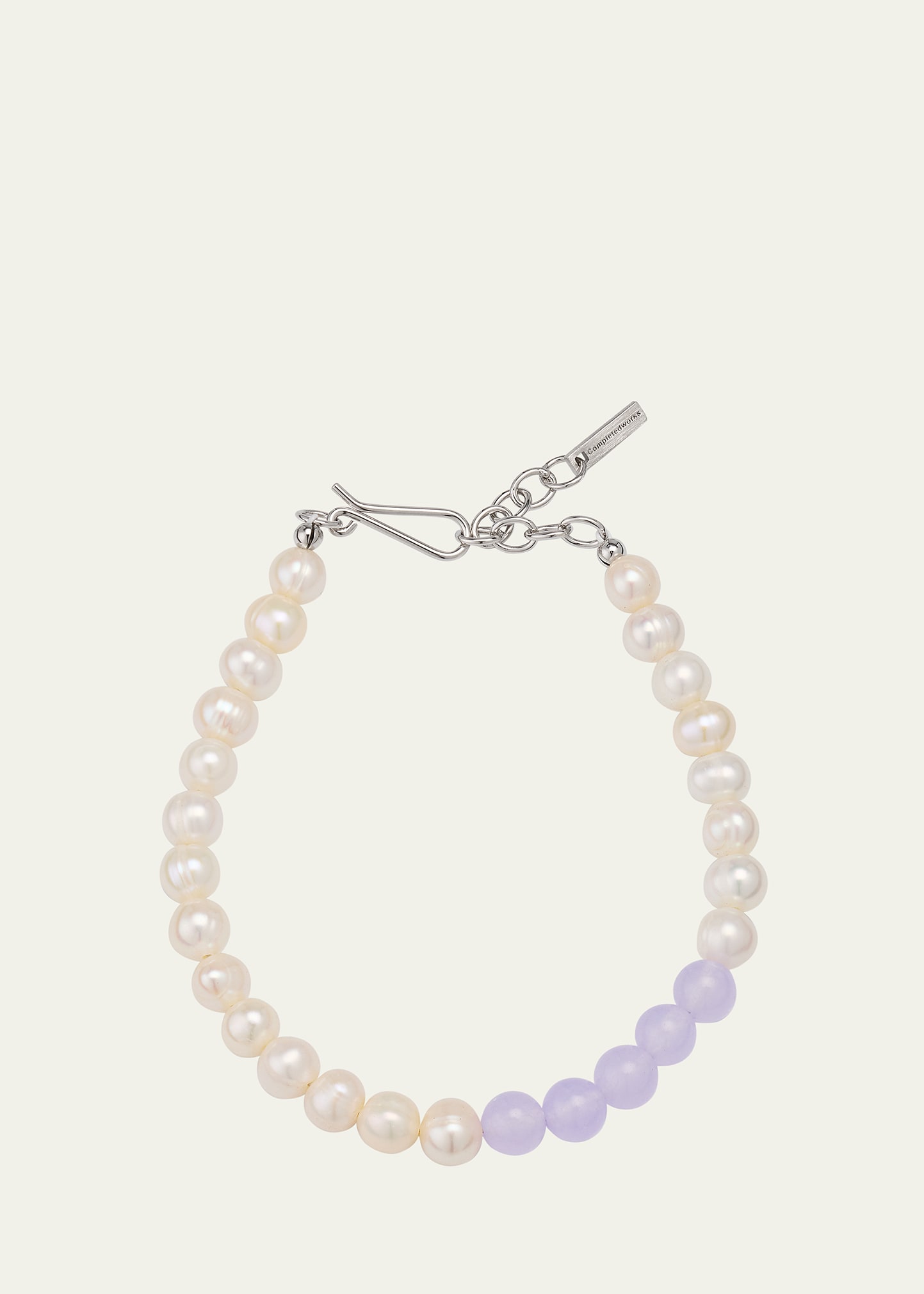 Completedworks bracelet in recycled silver Approx. 17.6cm Naturally white freshwater cultural pearls Lilac jade center Lobster clasp Imported