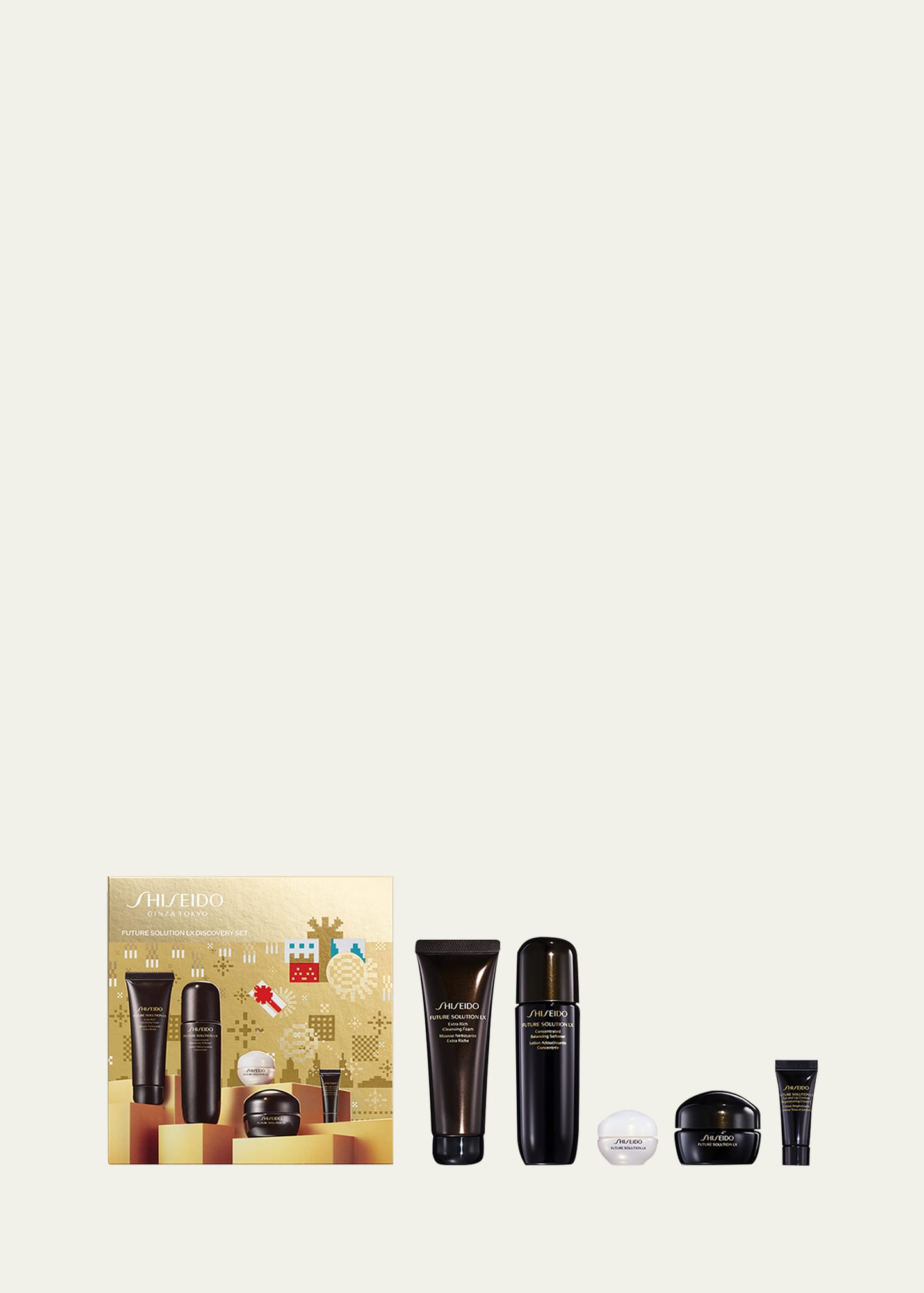 Future Solution LX Extra Rich Cleansing Foam, 50 m L Future Solution LX Concentrated Balancing Softener, 75 m L Future Solution LX Total Protective Cream SPF 20, 6 m L Future Solution LX Total Regenerating Cream, 15 m L Future Solution LX Eye and Lip Contour Regenerating Cream, 2.5 m L What It Does: Indulge in a new skincare regimen for luxurious anti-aging. This 5-piece set treats the skin for a youthful-looking appearance with a daily ritual of cleansing, softening, morning and evening moisturiz.