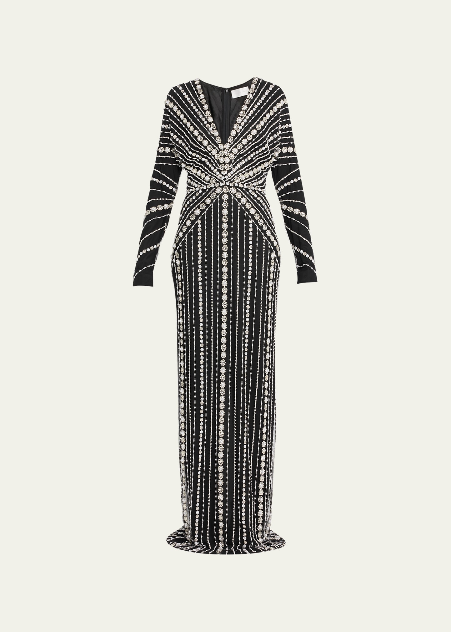 Pamella Roland tulle gown with linear embroidery V neckline Long dolman sleeves Column silhouette Hem pools floor Back zip Polyester self/lining Dry clean Made in USA from imported materials