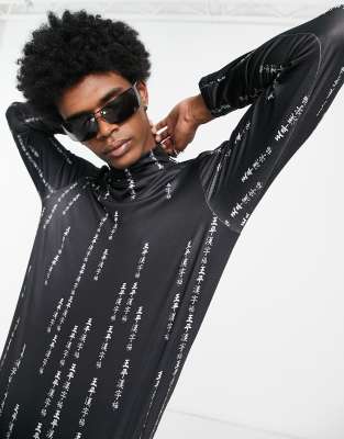 Liquor N Poker muscle fit long sleeve roll neck t-shirt in black with all over japanese text print