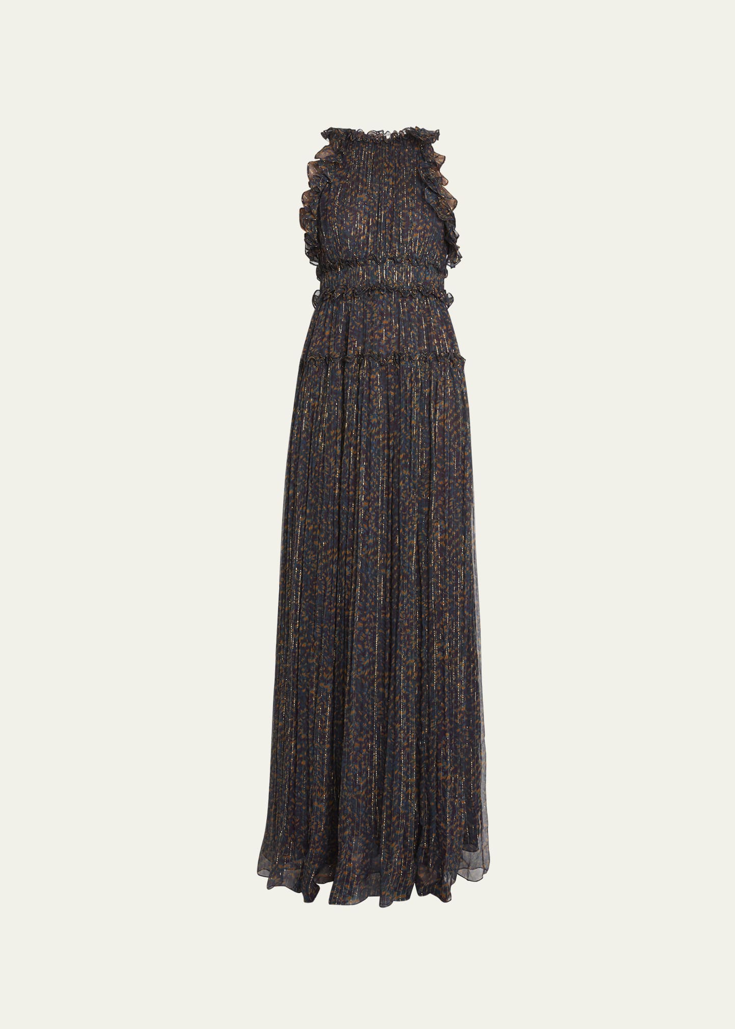 Ulla Johnson "Lira" ruffled dress in crinkled chiffon with metallic fibers Approx. 61.6"L from shoulder to hem Round neckline Sleeveless; cut-in shoulders A-line silhouette Floor-length hem Silk Lining: Polyester Dry clean Imported