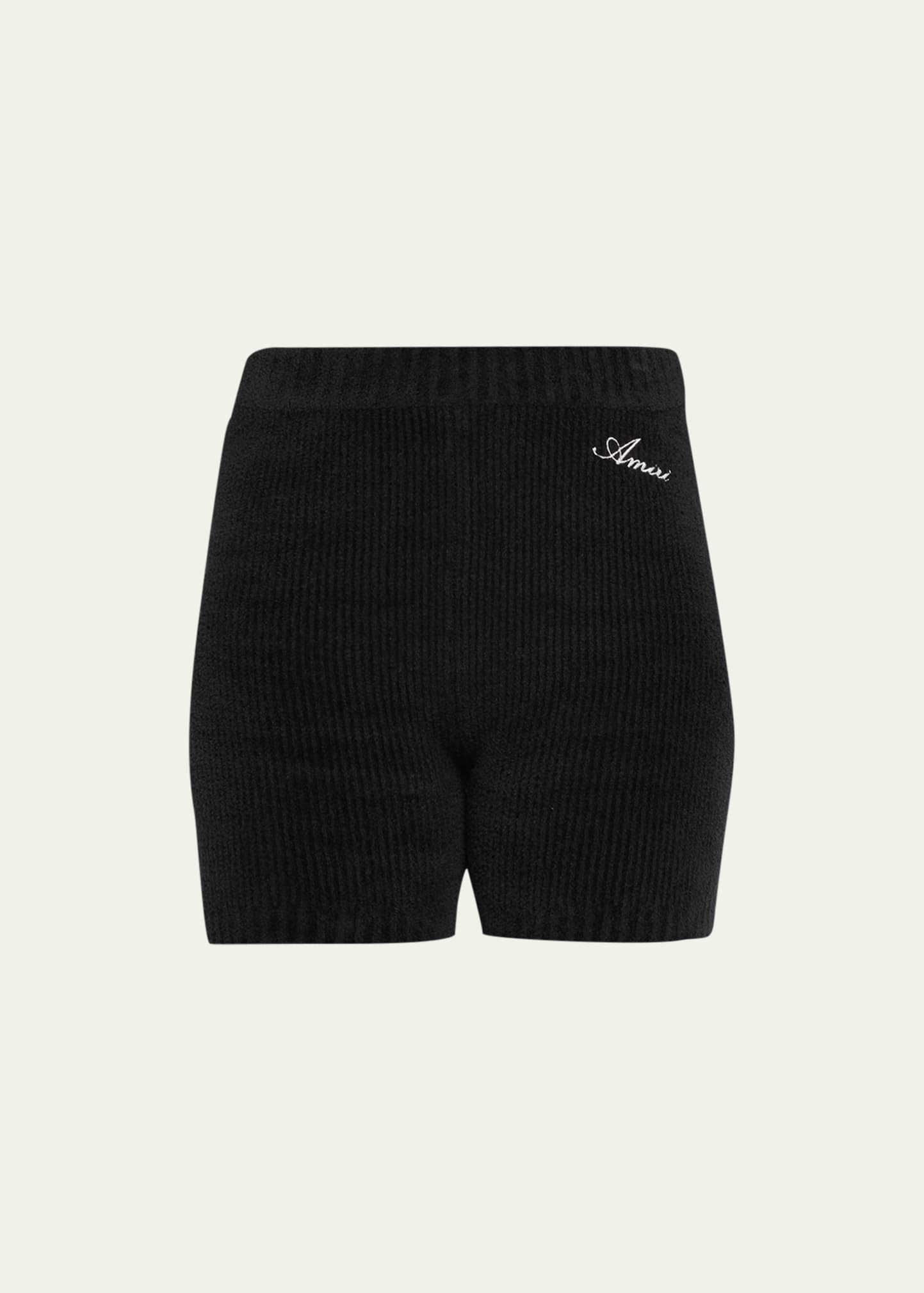 Amiri rib-knit sweater shorts with contrast logo embroidery High elastic waistband Fitted Mid-thigh length Step-in style Cotton/nylon/polyamide Dry clean Made in Italy