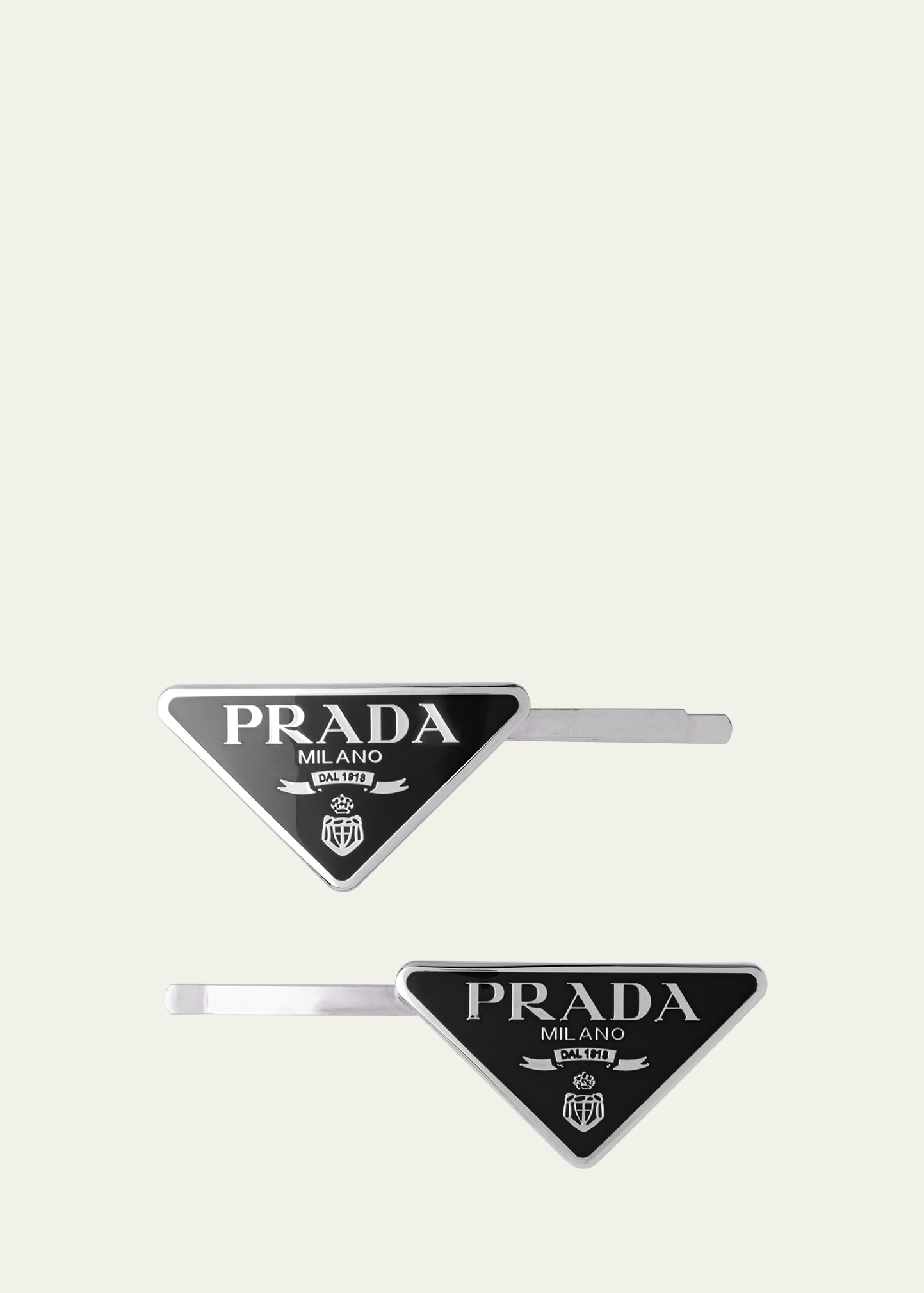 Prada logo hair pin set. Sliding closure. Hypoallergenic and nickel-free. Enameled logo. Steel pin. Set of two. Made in Italy.