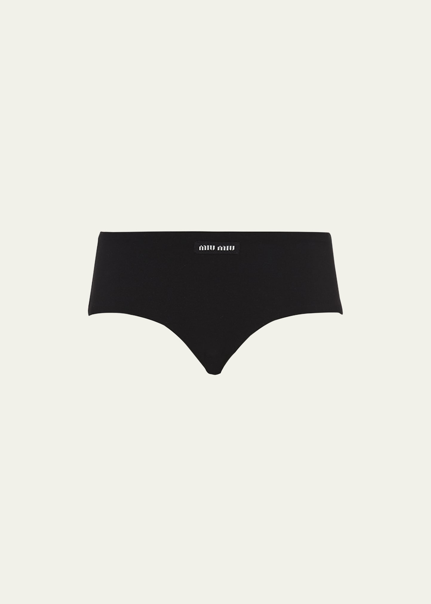 Miu Miu jersey boyshort underwear with logo tag on front Low rise Elasticized leg openings Full seat coverage Viscose/polyamide/elastane Made in Italy