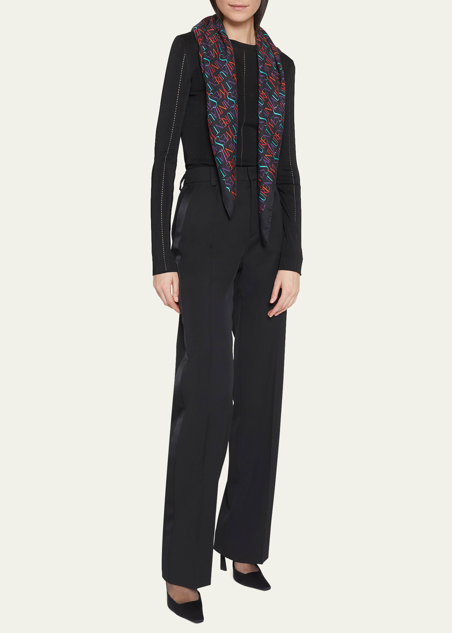 Saint Laurent graphic silk scarf featuring all-over horizontal signature logo May be styled multiple ways Made in Italy