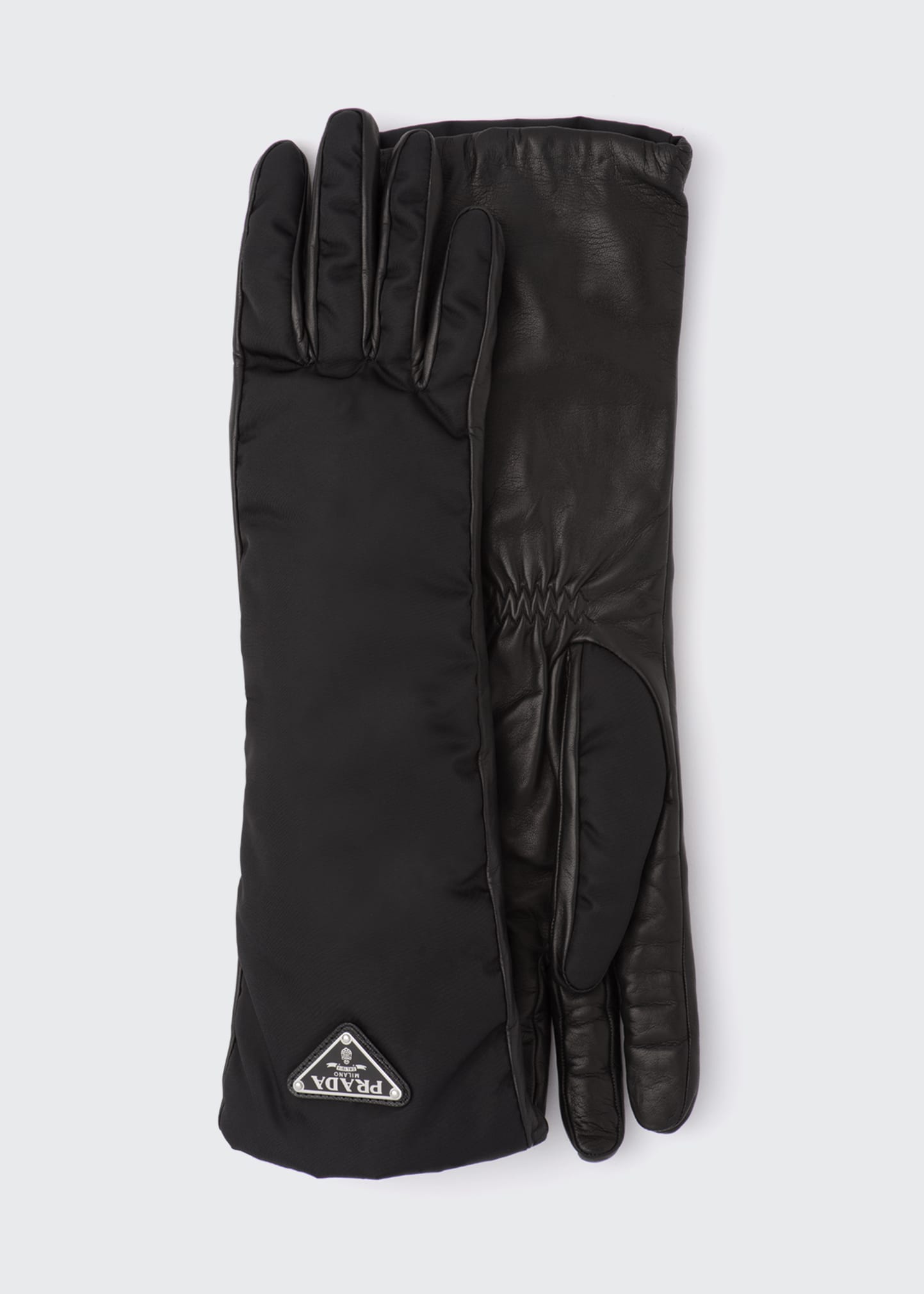 Prada long gloves. Enameled metal triangle logo at cuff. Napa leather palms. Nylon backs. Cashmere lining. Made in Italy.