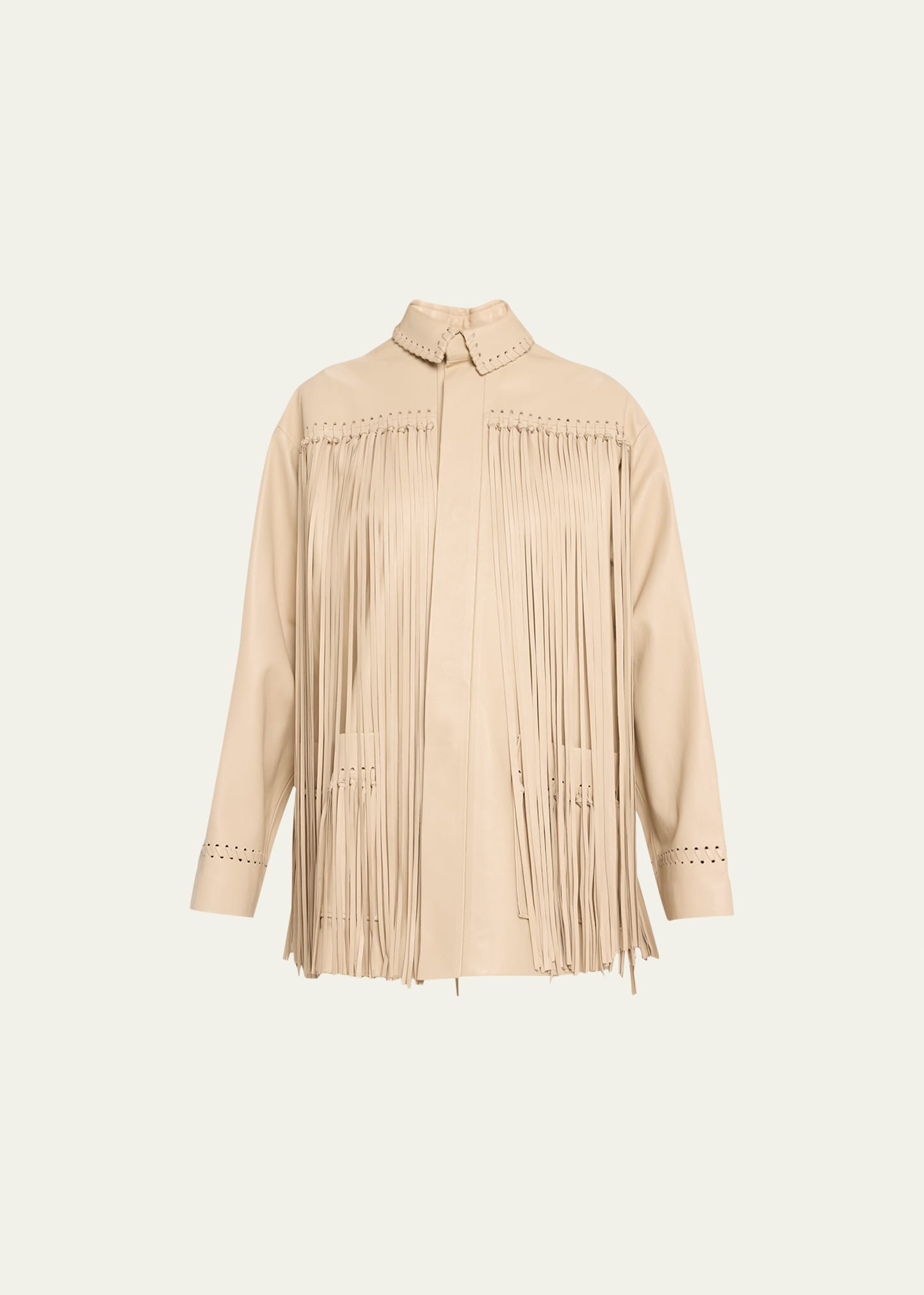 Oscar de la Renta smooth lambskin leather jacket adorned with whipstitch trim and fringe detailing Spread collar; concealed front placket Long sleeves Waist patch pockets Yoked back Straight fit Mid-length Lining: Silk Dry clean Made in Italy