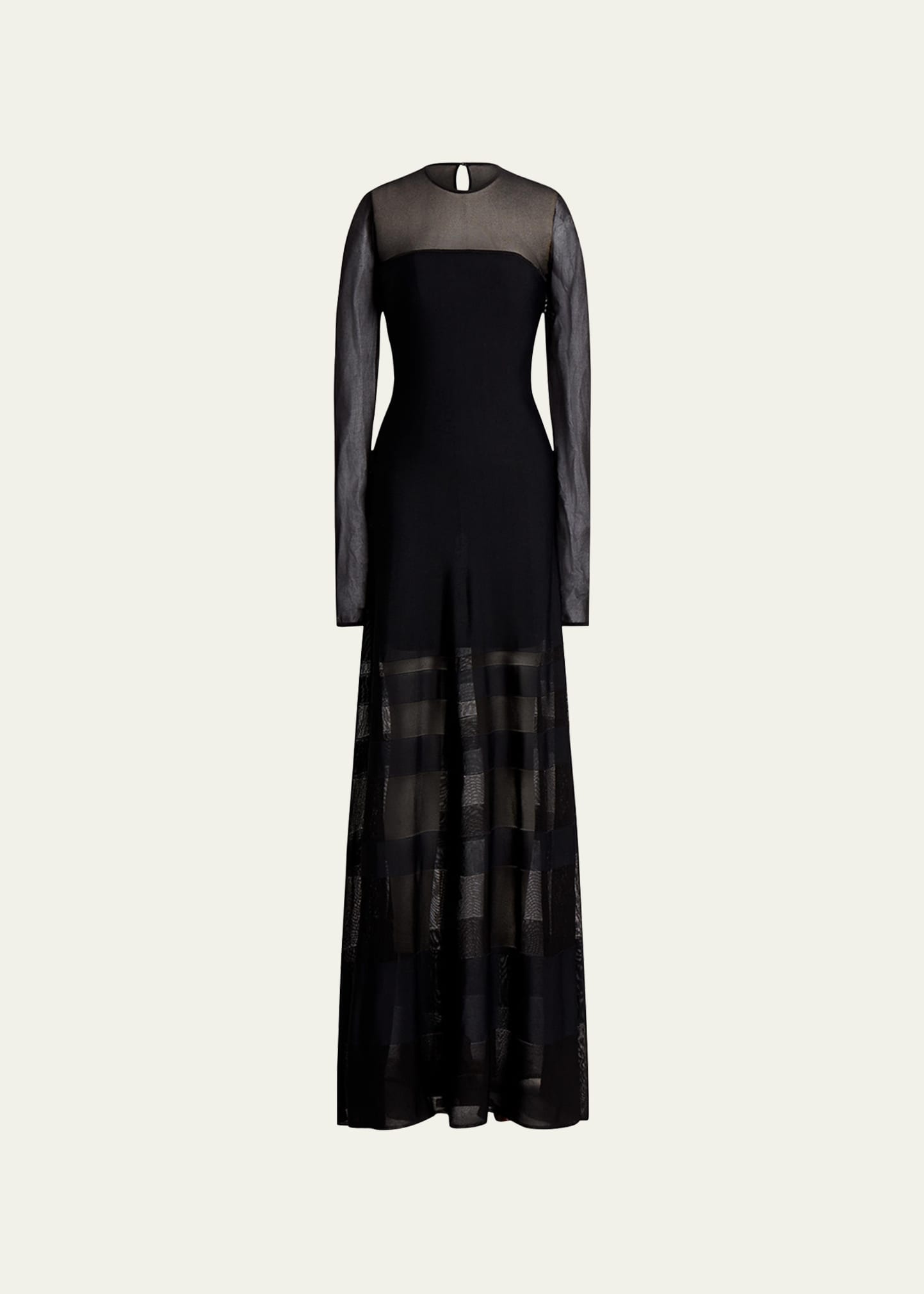 Ralph Lauren Collection gown featuring sheer and opaque striped skirt Approx. size medium: 61.5"L from shoulder to hem; 28.25"L sleeves High neckline; strapless illusion Long sleeves A-line silhouette Floor sweeping hem Invisible side zip Viscose/nylon/polyamide Made in Italy