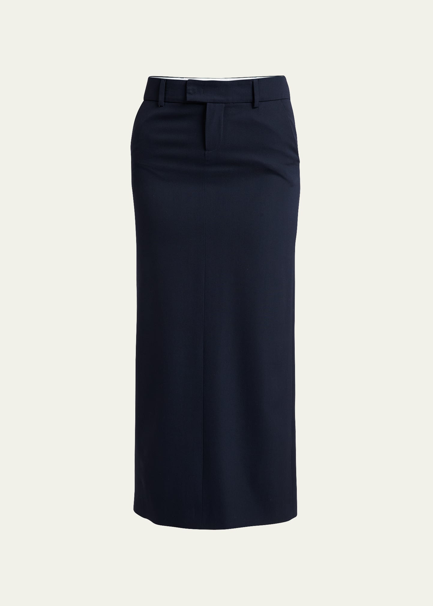 ARMARIUM "Loren" tube skirt High rise Slanted side pockets Back welt pockets Vented back Hem falls below the knee Skirt falls straight from hip to hem Hidden button/zip fly; belt loops Wool Made in Italy