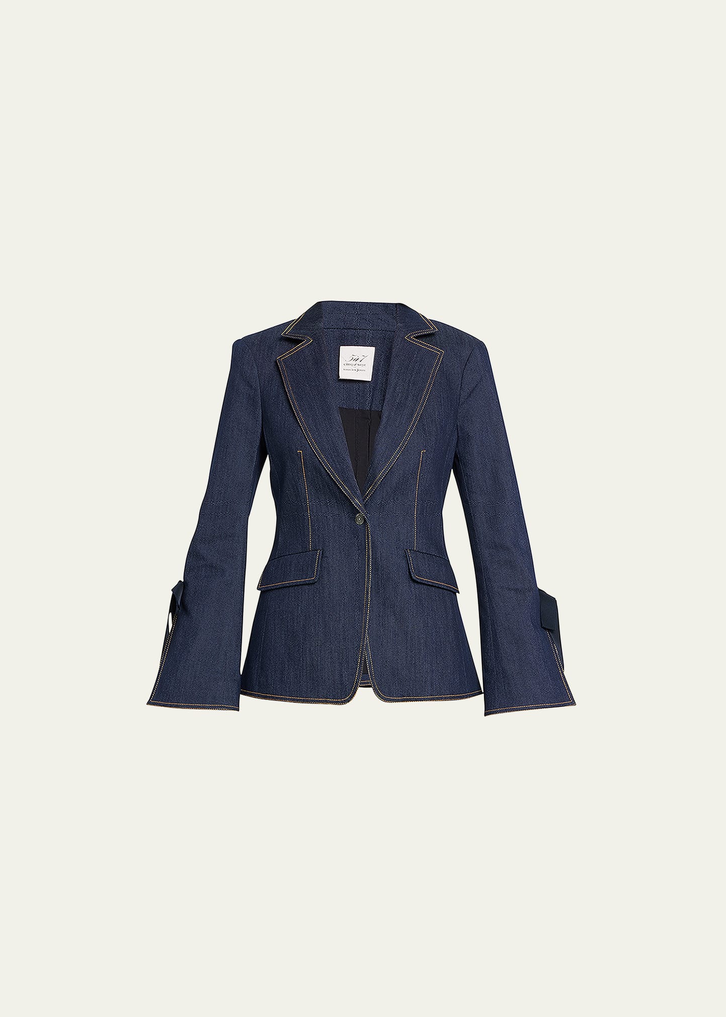 Cinq à Sept "Lou" denim blazer elevated by contrast topstitching and split tie cuffs Approx. 26"L from shoulder to hem Notched lapels; button front Long sleeves; approx. 32.0"L Princess seams Tailored fit Front flap pockets Cutaway front Hits below the hips Cotton/polyester/elastane Lining: Polyester Dry clean Imported