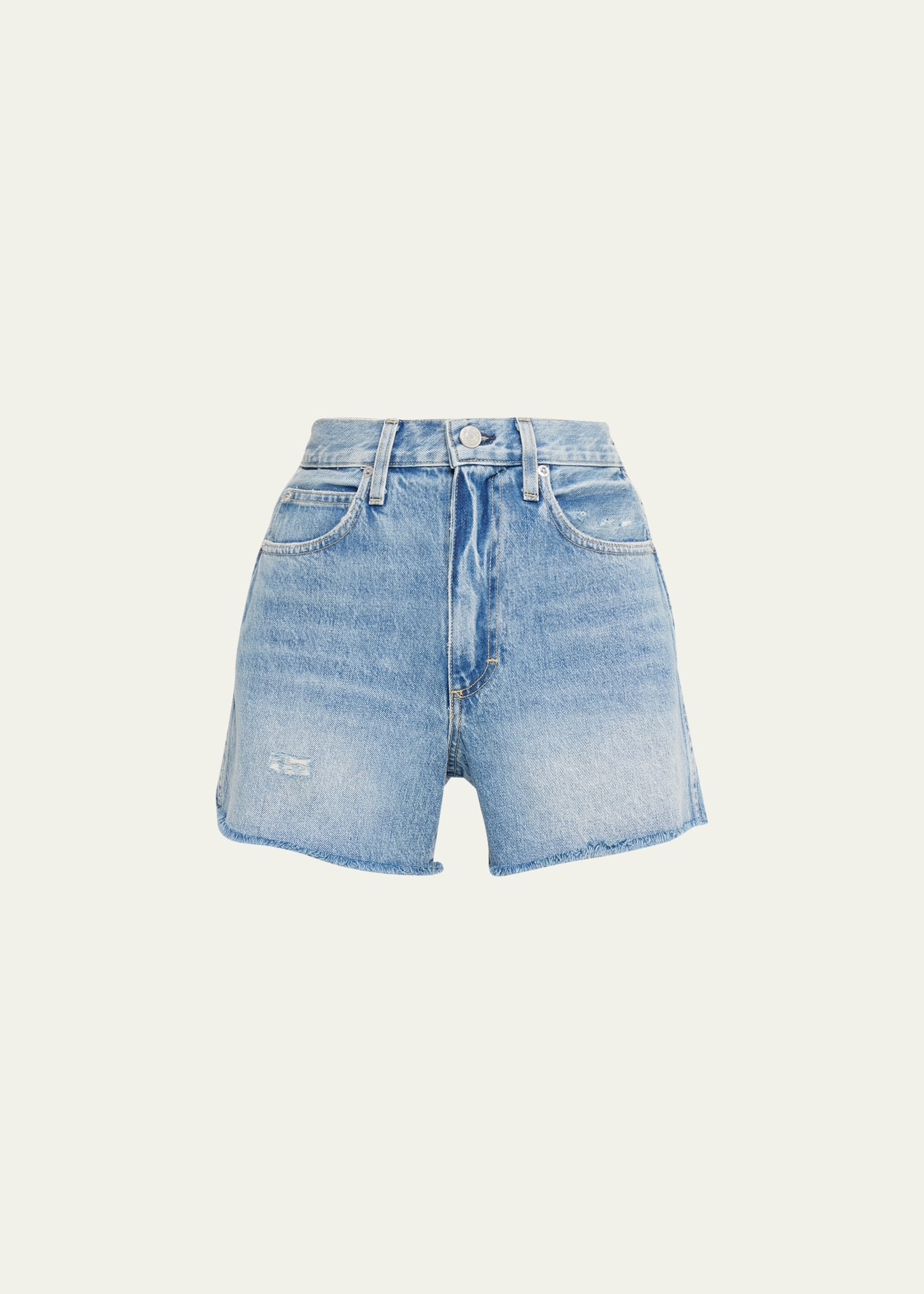 AMO Denim "Loverboy" denim shorts featuring a frayed hem with fading throughout Five-pocket style High rise Flared fit Button/zip fly; belt loops Cotton Made in USA
