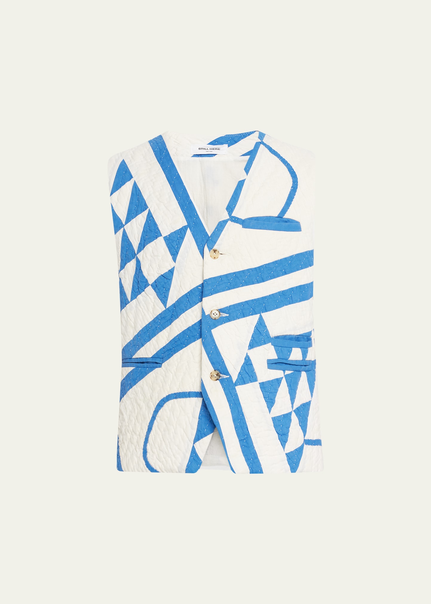 Still Here "Ludlow" quilted vest featuring horn buttons and an adjustable strap at back V neckline Sleeveless Welt pockets Tailored fit Cutaway hem Button-front closure Cotton Imported