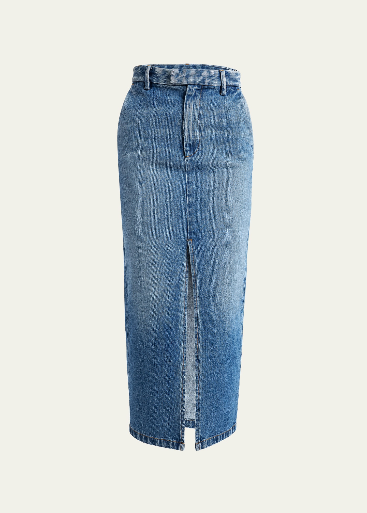 ARMARIUM "Lula" denim pencil skirt with a front center slit High rise Button/zip fly; belt loops Side slip pockets; back welt pockets Hem falls below the knee Pencil style Cotton Made in Italy