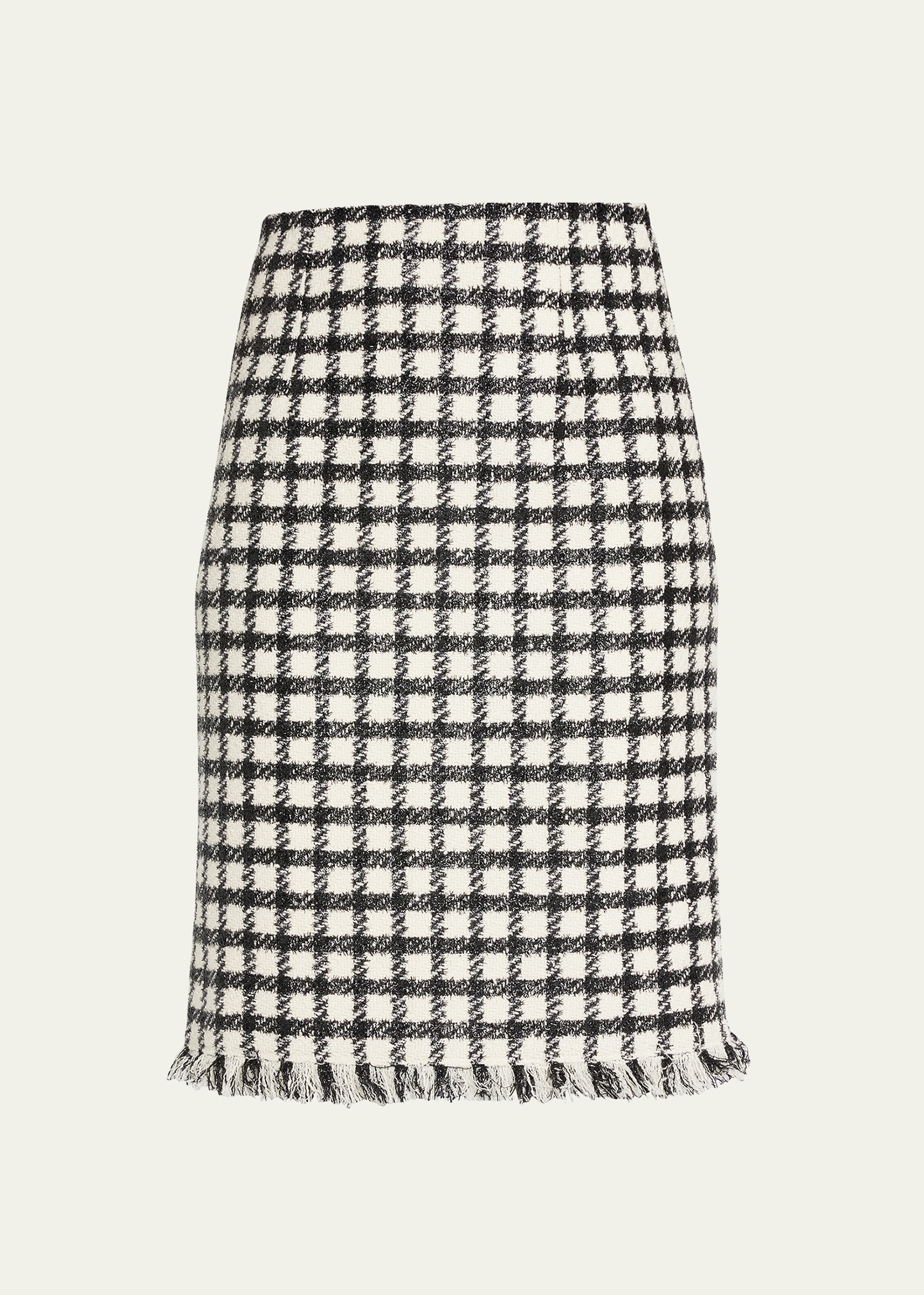 Oscar de la Renta lurex check print tweed pencil skirt with fringe detailing at the hemline High rise Concealed back zip Hem hits around the knee Pencil style Virgin wool/polyester/nylon Lining: Silk Made in Italy