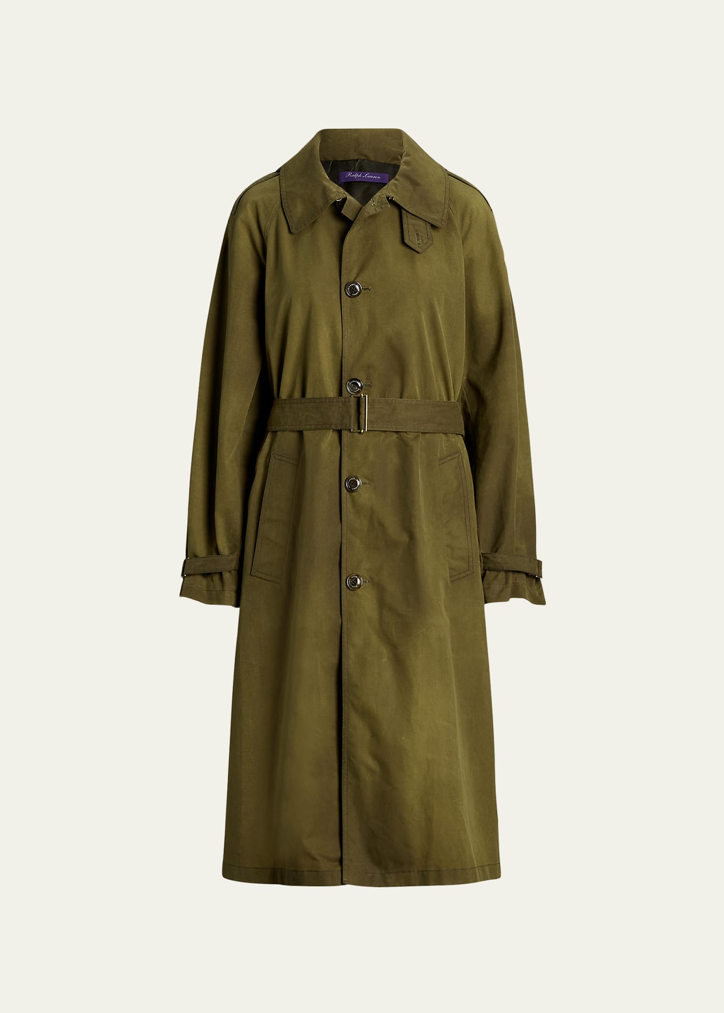 Ralph Lauren Collection "Lysander" solid coat Spread collar with throat latch; button front Long sleeves; belted cuffs Side slip pockets Adjustable belted waist A-line silhouette Mid length Cotton Polyester/wool lining Made in Italy