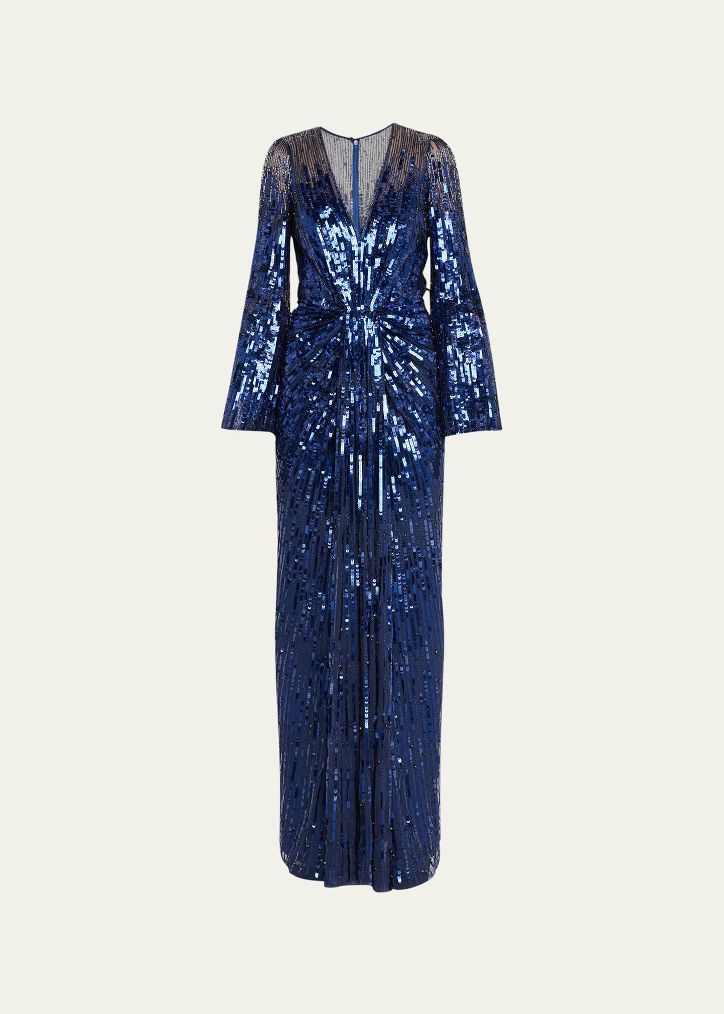Jenny Packham "Margot" tulle gown in allover sequin embellishment V neckline Long sleeves Column silhouette Full length Back zip Polyester Polyester/elastane lining Dry clean Imported