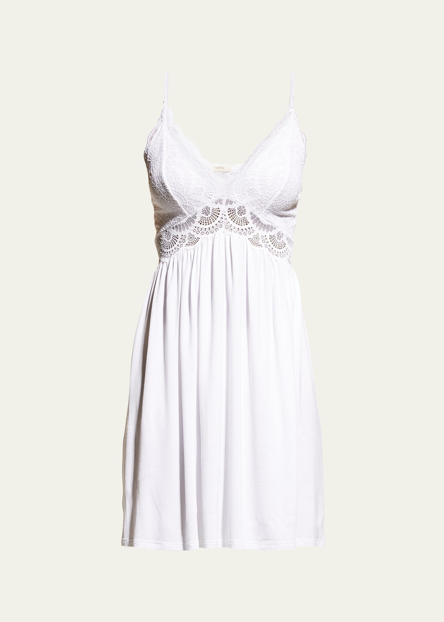 Eberjey "Marianna Mademoiselle" chemise with lace trim V neckline; square back Thin, adjustable straps Empire waist Hem hits above knees A-line silhouette Slipover style Modal/spandex; nylon/rayon/spandex lace Imported