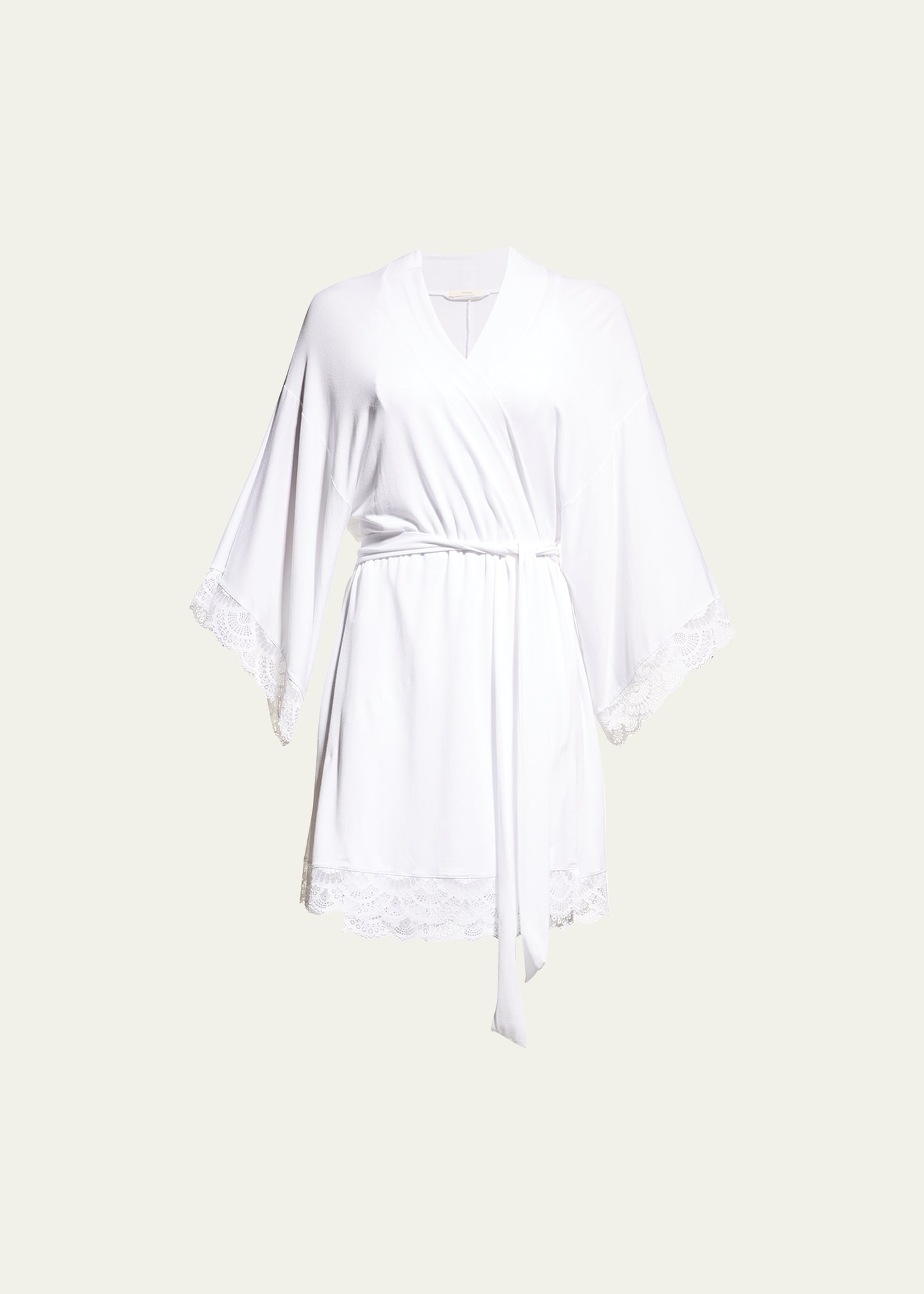 Eberjey "Marianna Mademoiselle" short kimono robe with scalloped lace trim Shawl collar; open front Three-quarter sleeves Self-tie sash at waist Scalloped hem hits above knees A-line silhouette Modal/spandex Nylon/rayon/spandex lace Imported