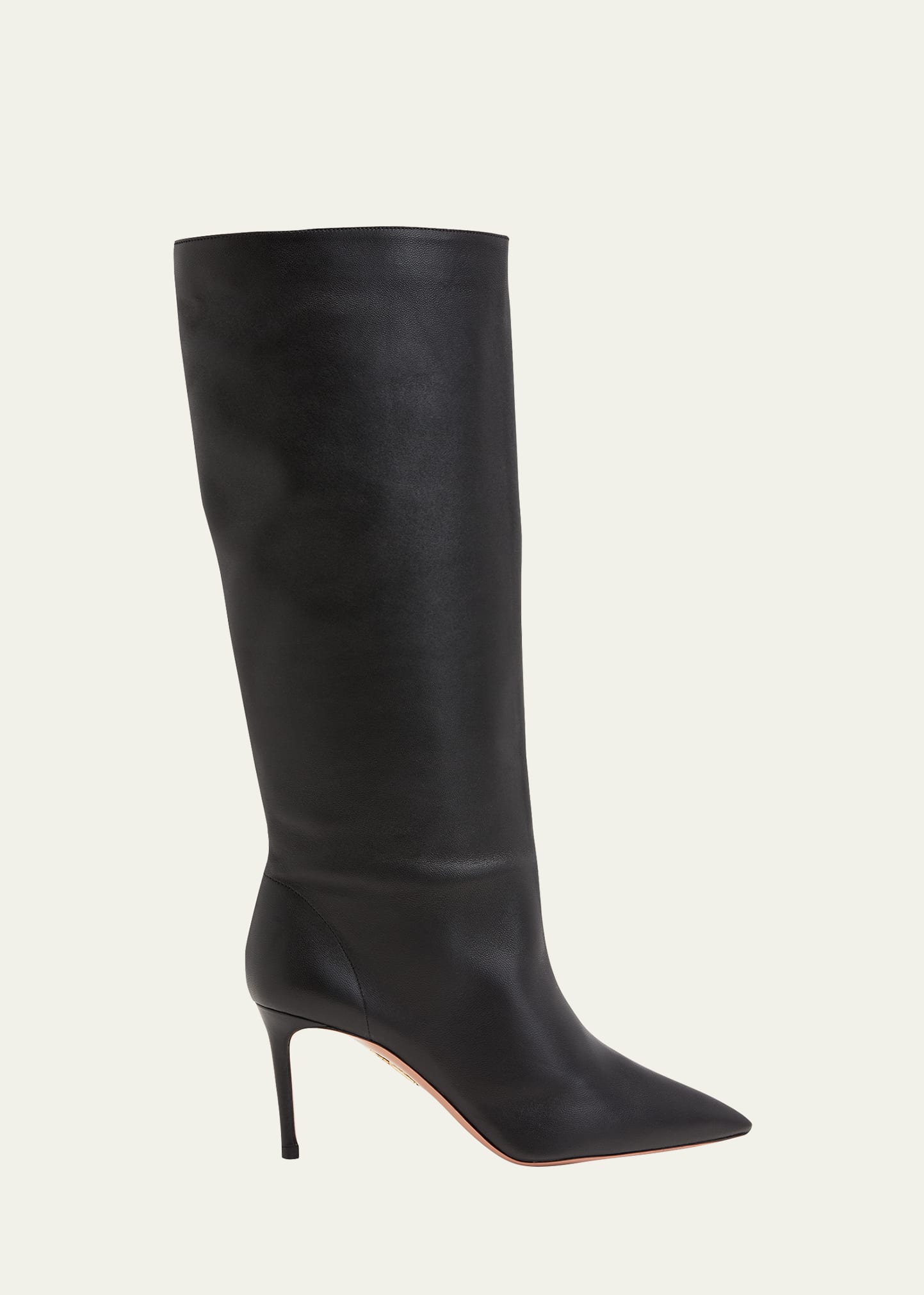Aquazzura "Matignon" soft lambskin leather tall boots 3.00 in / 75 mm stiletto heel Pointed toe Pull-on style Leather outsole Lining: Leather Made in Italy