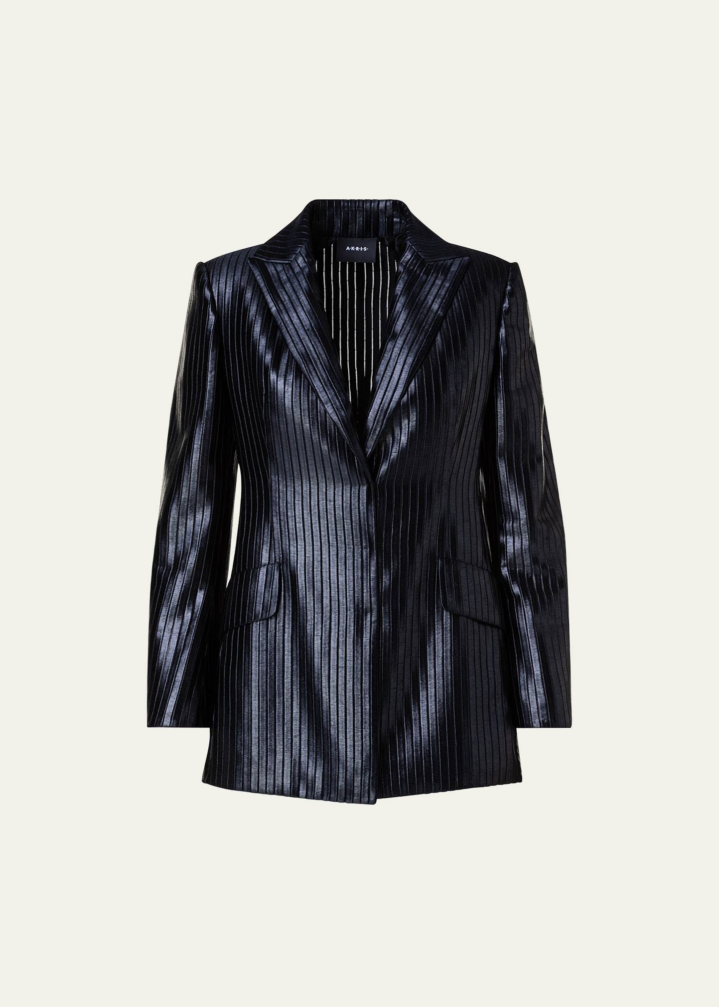 Akris "Matthieu" blazer jacket with techno stripe embroidery all-over Single-breasted front Peak lapel collar Concealed front closure Long sleeves Side flap pockets Mid-length Relaxed fit Polyester Lining: Cupro Dry clean Made in Romania