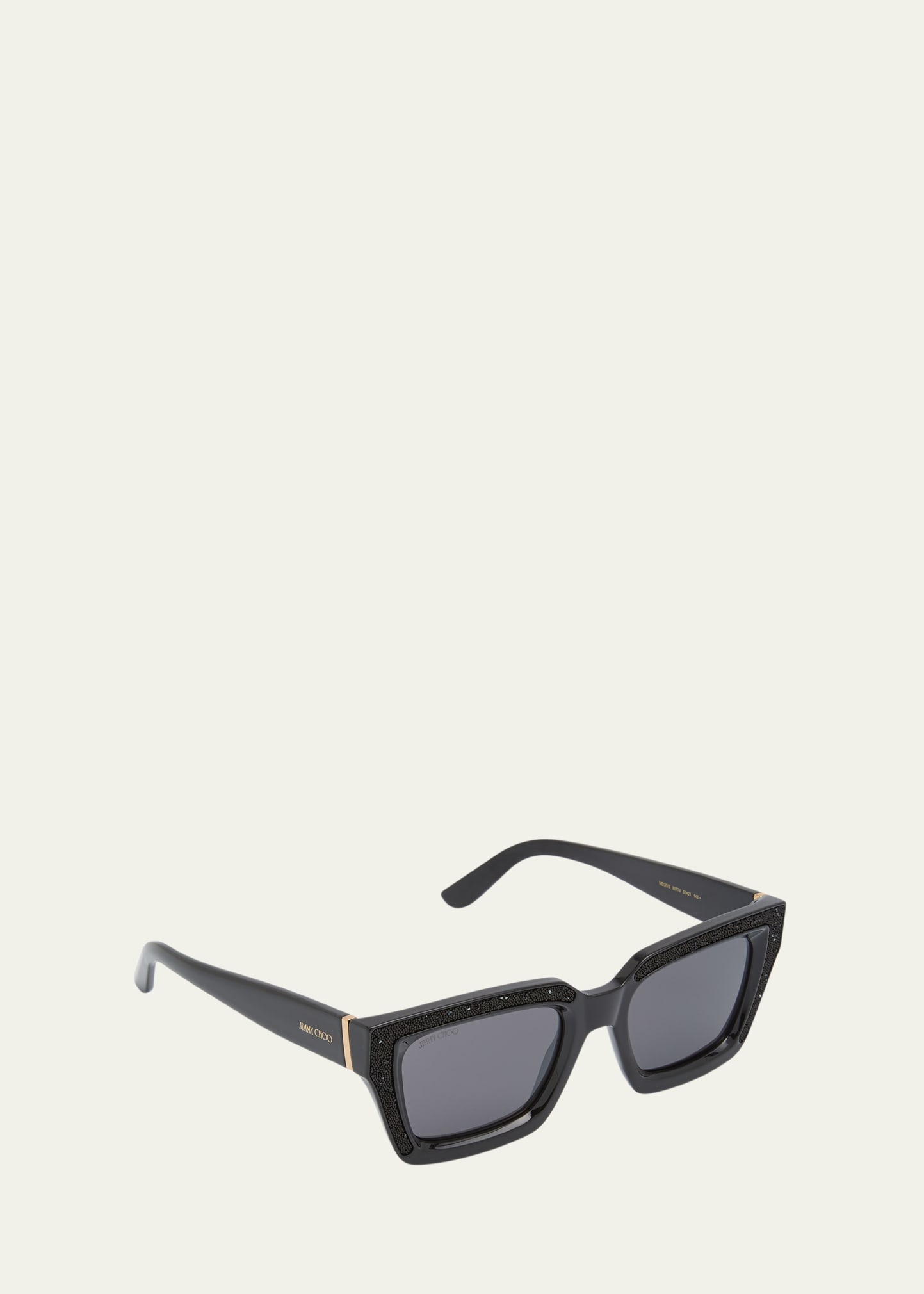 Jimmy Choo "Megs" rectangle sunglasses in propionate plastic Features luxurious Swarovski® crystal panels on the front of these ultra-chic frames. Lens/bridge/temple (in mm): 51-21-145 Saddle nose bridge Logo on temples Thin, tapered arms Wipe clean 100% UVA/UVB protection Made in Italy
