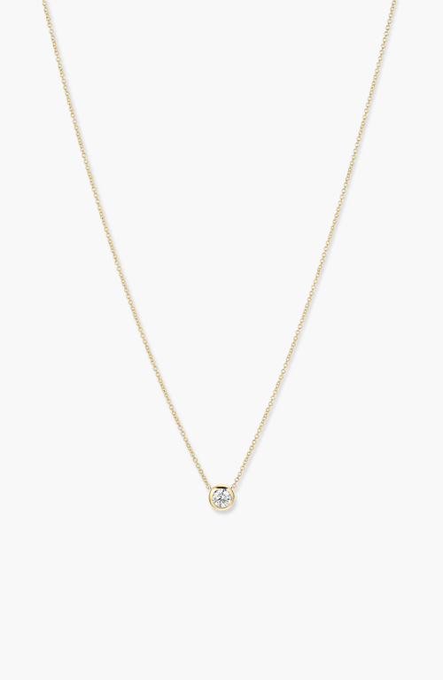 Double the size of the Diamond Necklace. This heirloom-worthy piece is something you can hold on to forever. 14k gold with natural diamonds Minimum carat weight 0.23 ct; diamond clarity SI–I; diamond color G–H–I; stone size 4mm Pendant diameter 5.7mm Chain length 16–18 inches adjustable Bezel-set round diamond pendant on a delicate cable chain Rhodium-plated for added shine and durability (white gold only) Water resistant and hypoallergenic Crafted for lasting wear and everyday elegance