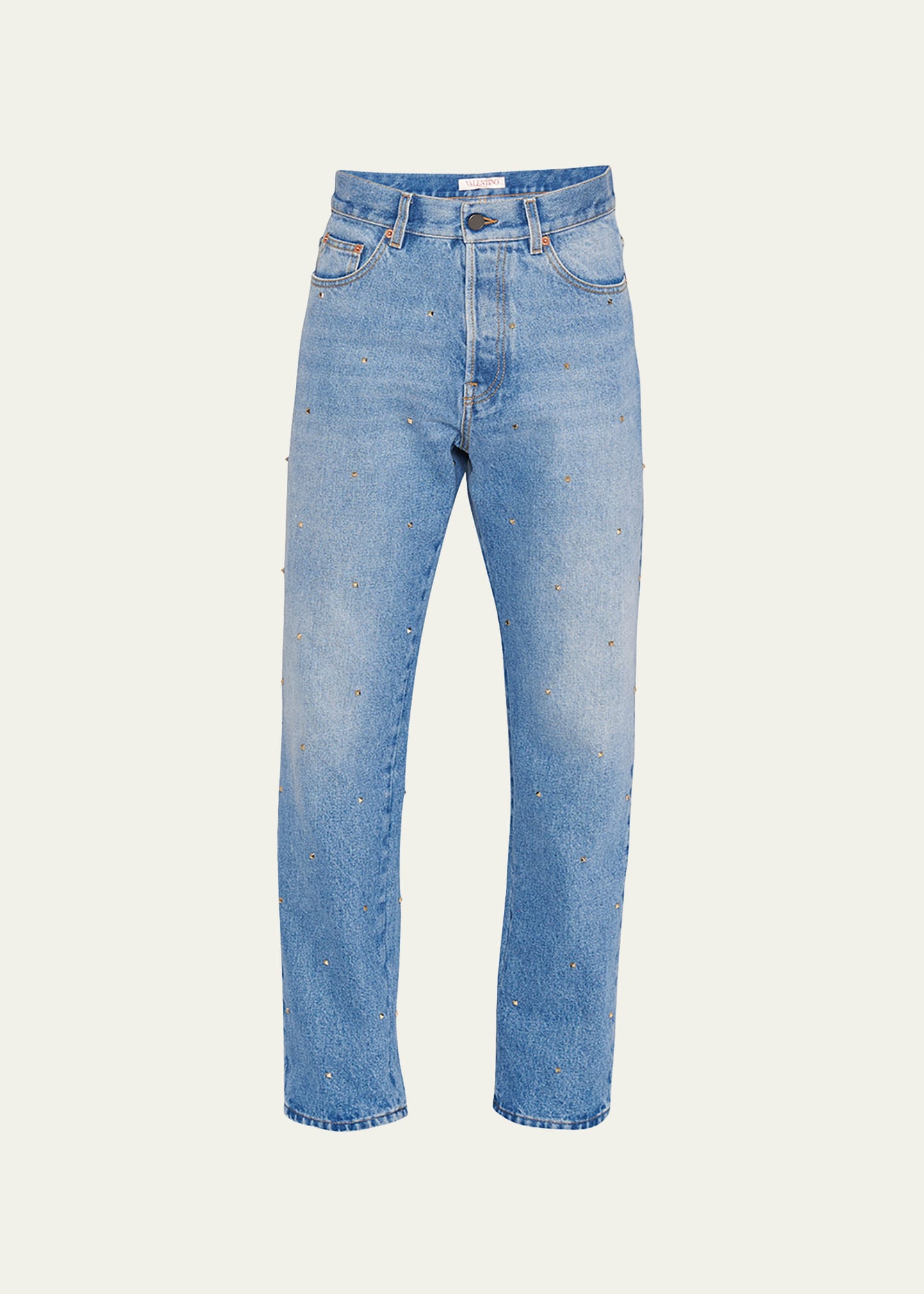 Valentino jeans with allover Rockstud embellishment Regular rise Five-pocket style Full length Straight legs Button closure/zip fly; belt loops Cotton Made in Italy
