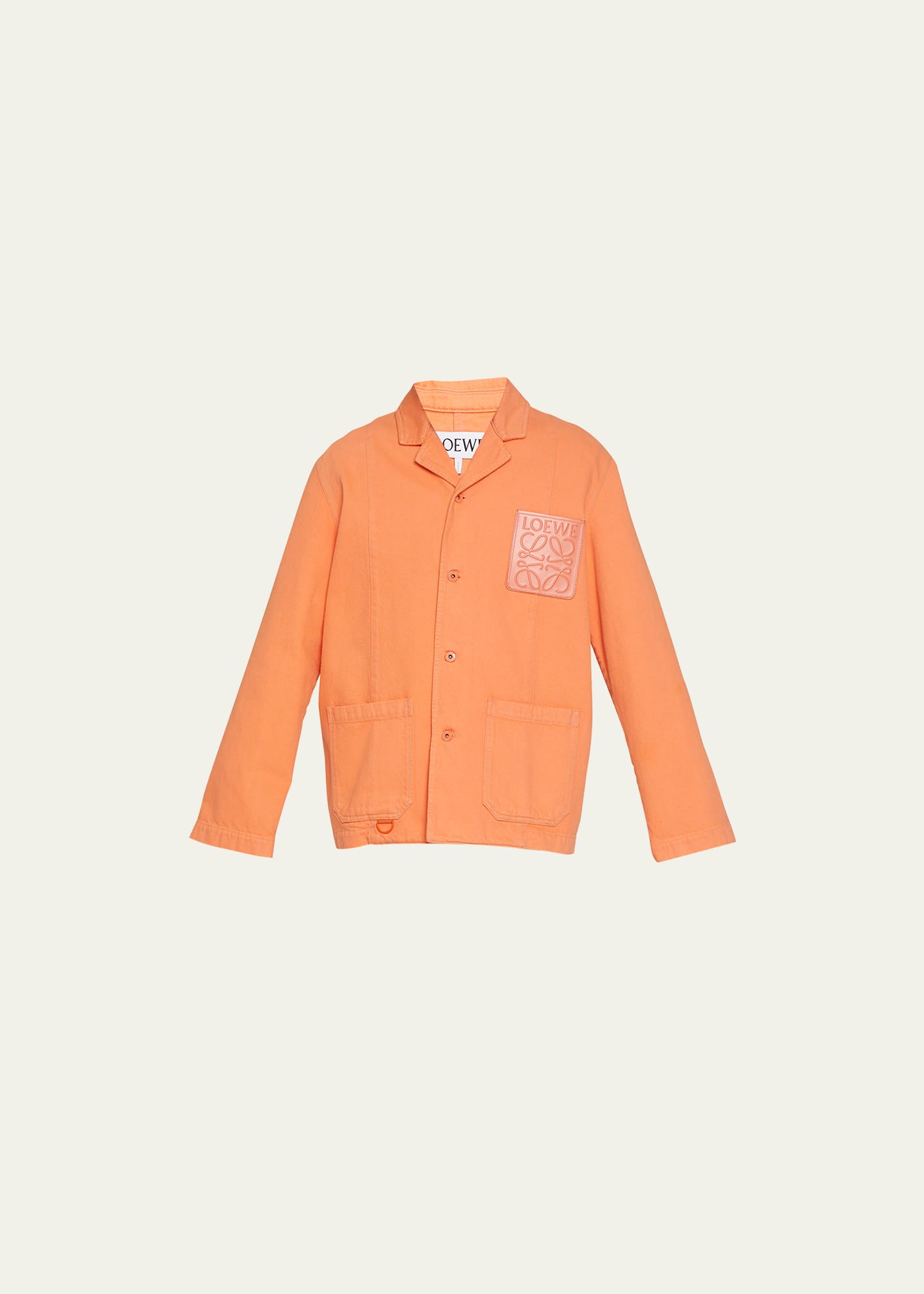 Loewe work jacket in washed denim Notched collar; button front closure Tonal calf leather Anagram patch at chest Patch pockets Oversized fit Long sleeves Cotton Made in Italy