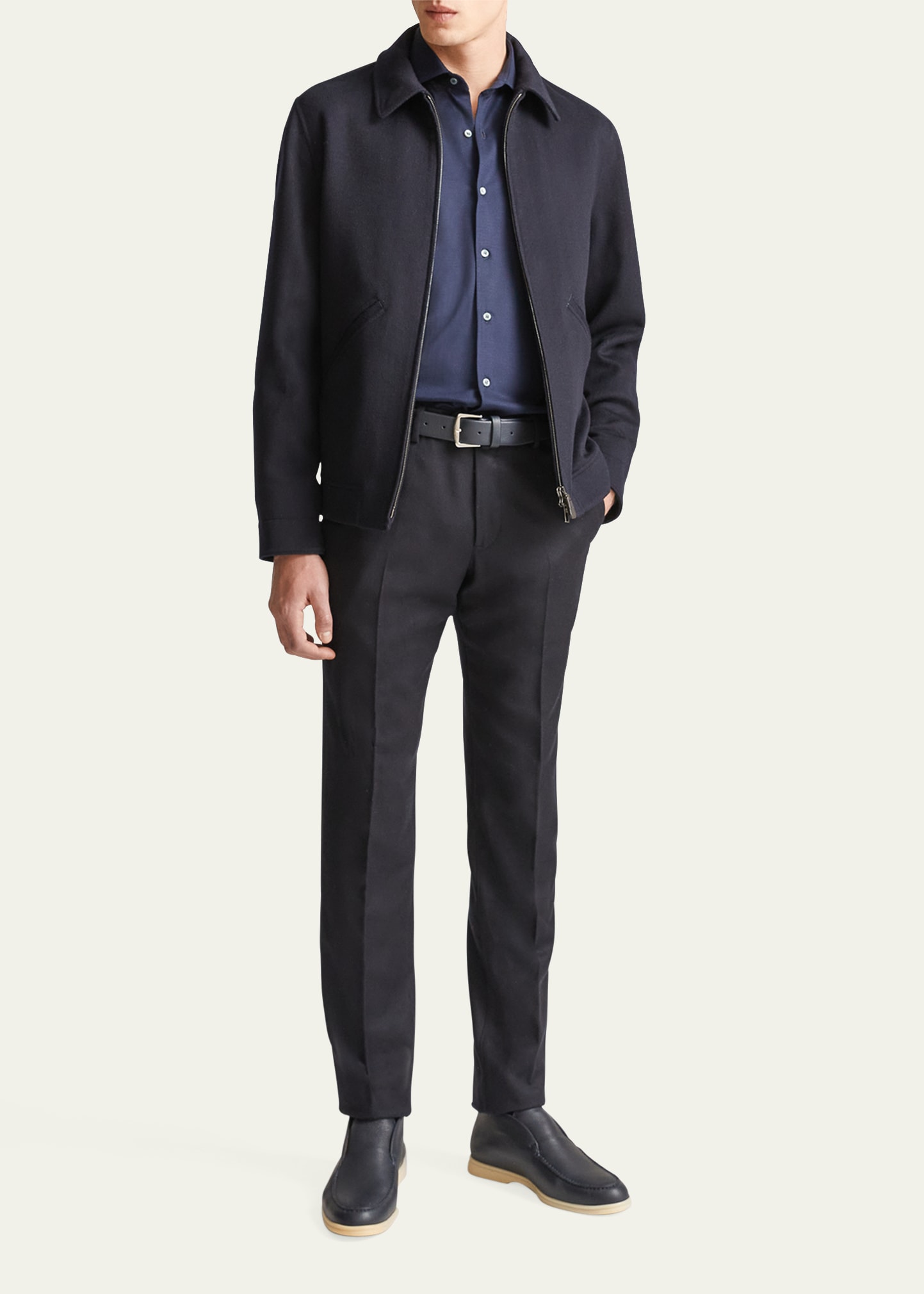 Loro Piana "Andrew" sport shirt in premium jersey piqué fabric Spread collar; button placket Long sleeves Round barrel cuffs Yoked back shoulders Classic fit Virgin wool Made in Italy