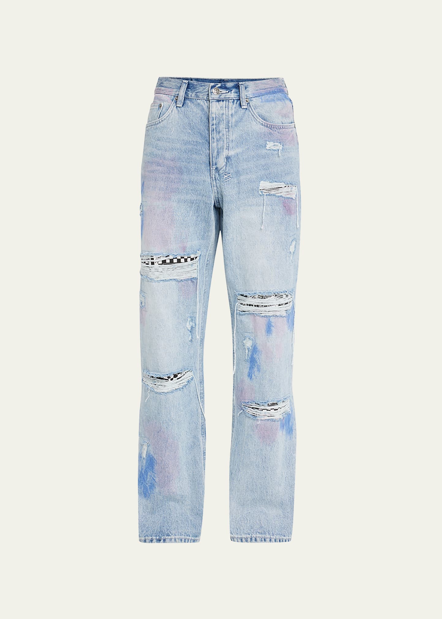 Ksubi "Anti K Streets Kolor" jeans made from a premium rigid denim in a medium faded wash Features tie-dye treatment and rip & repair deconstruction with printed patches Regular rise Five-pocket style Full length Straight legs Button closure/zip fly; belt loops Cotton Imported