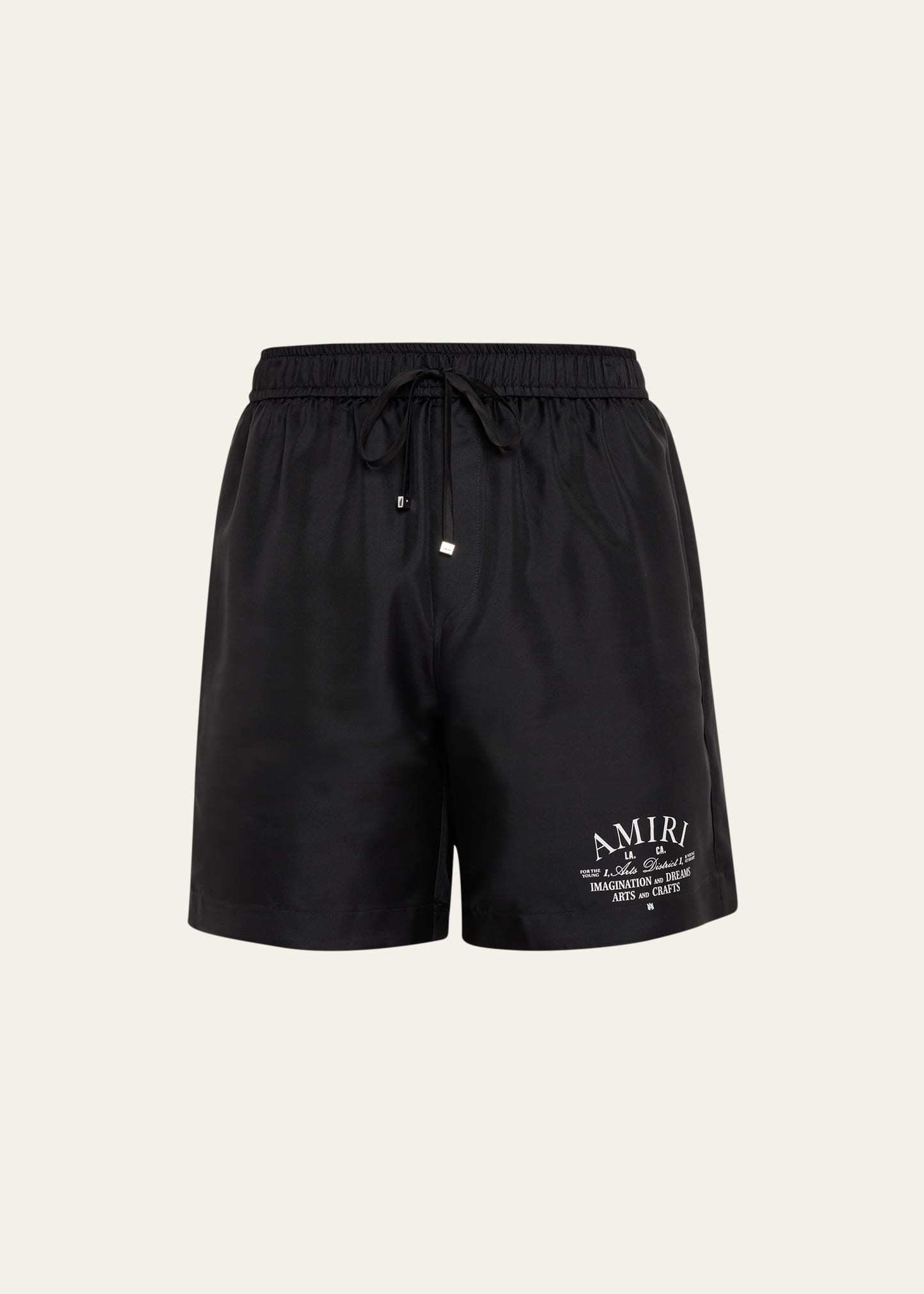 Amiri shorts with Arts District print at front hem Elasticized drawstring waist Side seam pockets Relaxed legs Pull-on style Silk Made in Italy