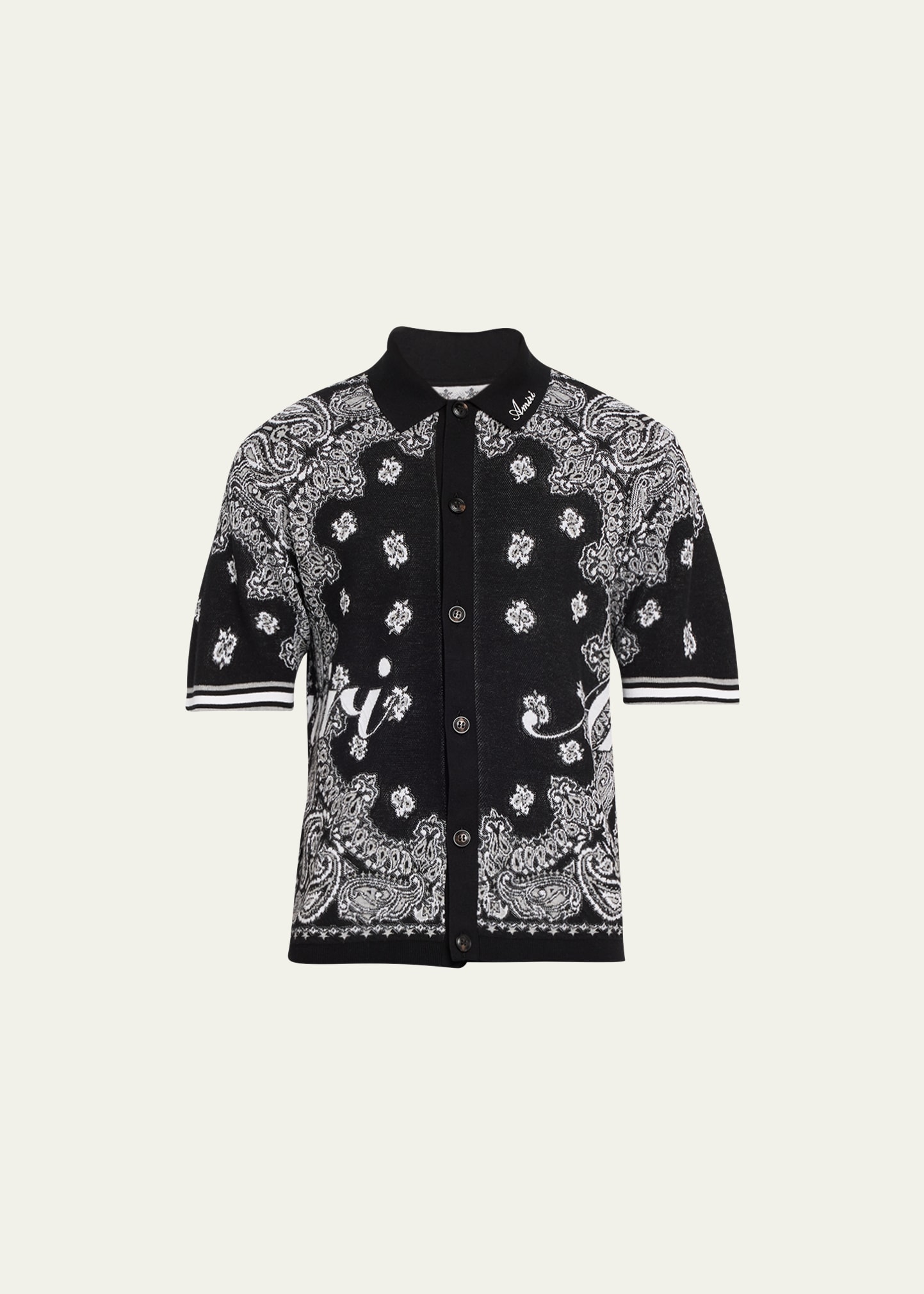 Amiri polo sweater in bandana logo intarsia knit Spread collar; embroidered logo Button placket Short sleeves Ribbed cuffs and hem Cotton Made in Italy