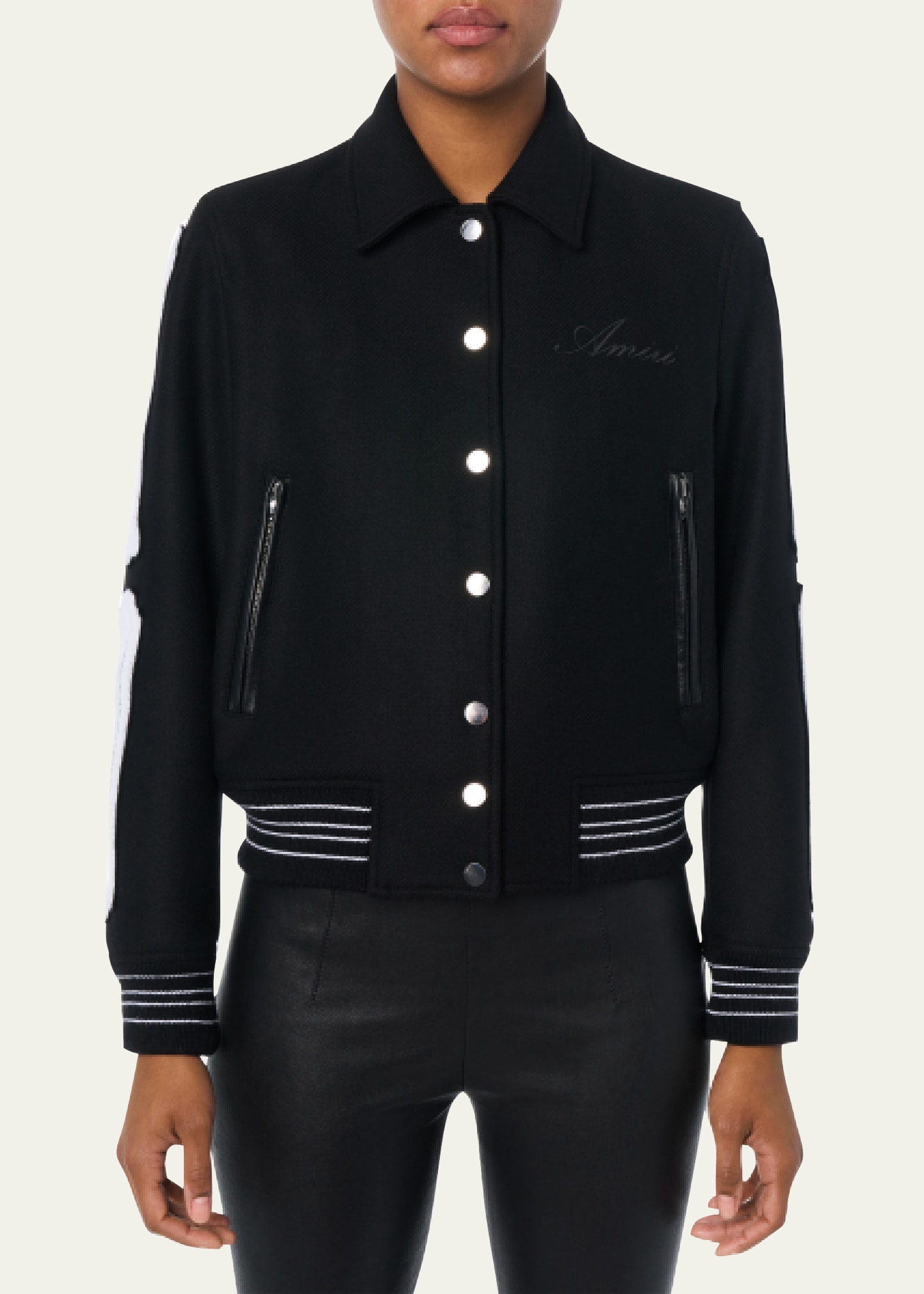 Amiri "Bones" varsity jacket features chenille bone appliqués on sleeves and embroidered logo Spread collar; button placket Long sleeves Front zip pockets Regular fit Ribbed cuffs and hem Virgin wool/polyamide Calf leather trim Dry clean Made in Italy
