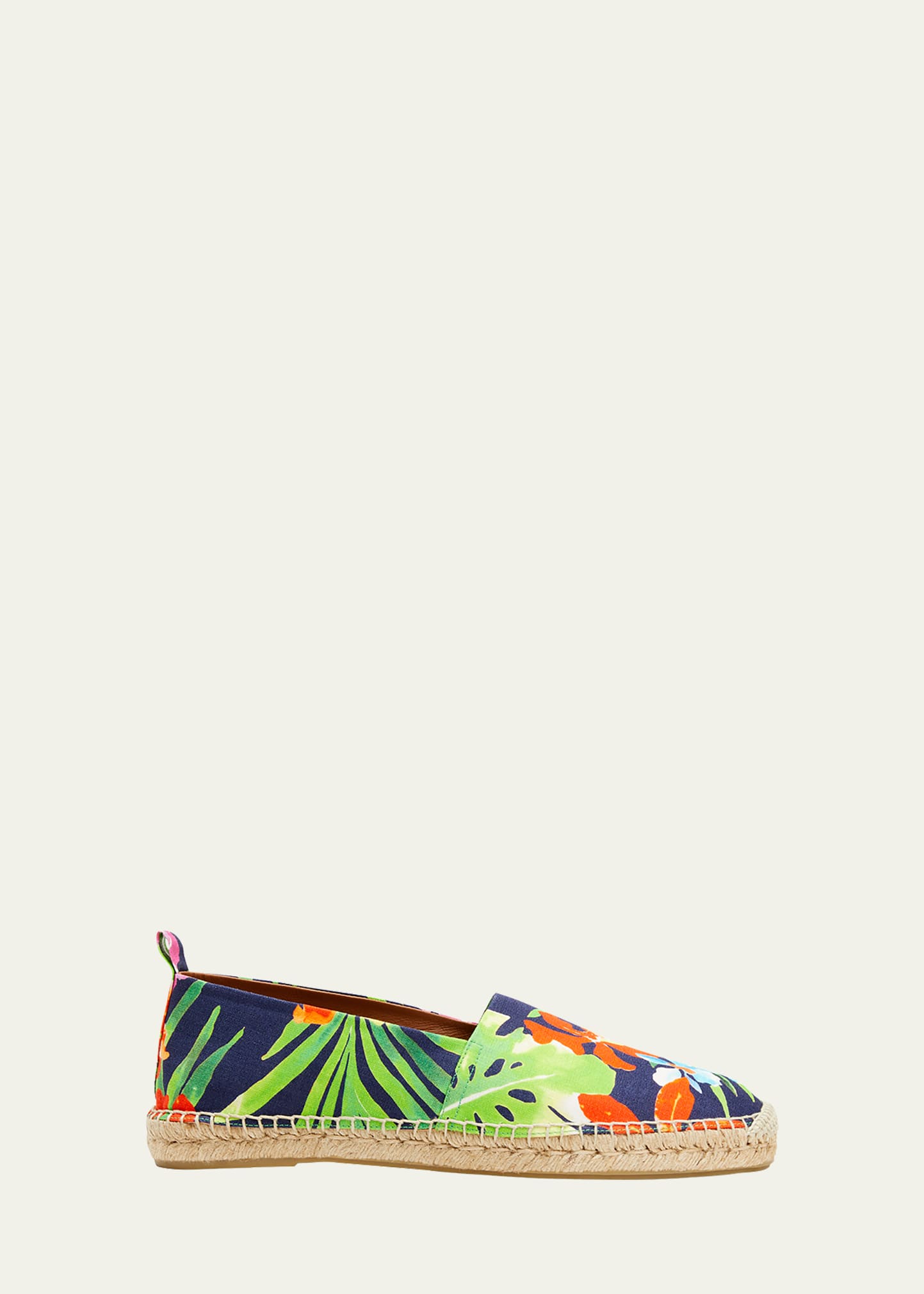 Ralph Lauren Home "Bosworth" espadrilles in tropical-printed linen Braided flat jute heel Jute-capped round toe Pull tab at backstay Rubber outsole Slip-on style Made in Spain