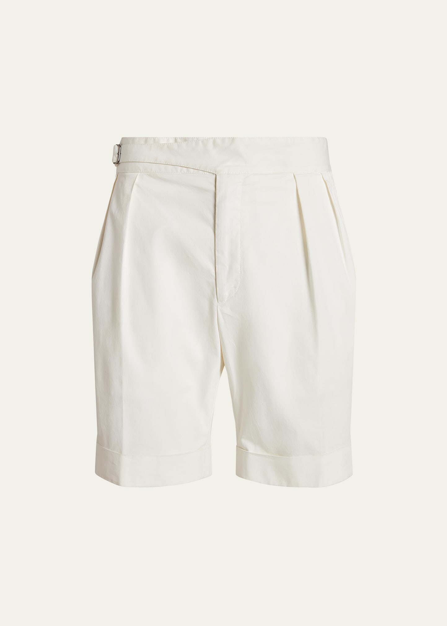 Ralph Lauren Home "Byron" chino shorts are expertly crafted with Italian garment-dyed stretch fabric to achieve a relaxed look Approx. 8.5" inseam; (size 32w ) 9.75" rise Buckled waistband Button-zip-fly Genuine horn buttons High rise; double-pleated front Side slant pockets Back button pockets Model is 6'1"; size 32W Unlined Cotton/elastane Dry clean Made in Portugal