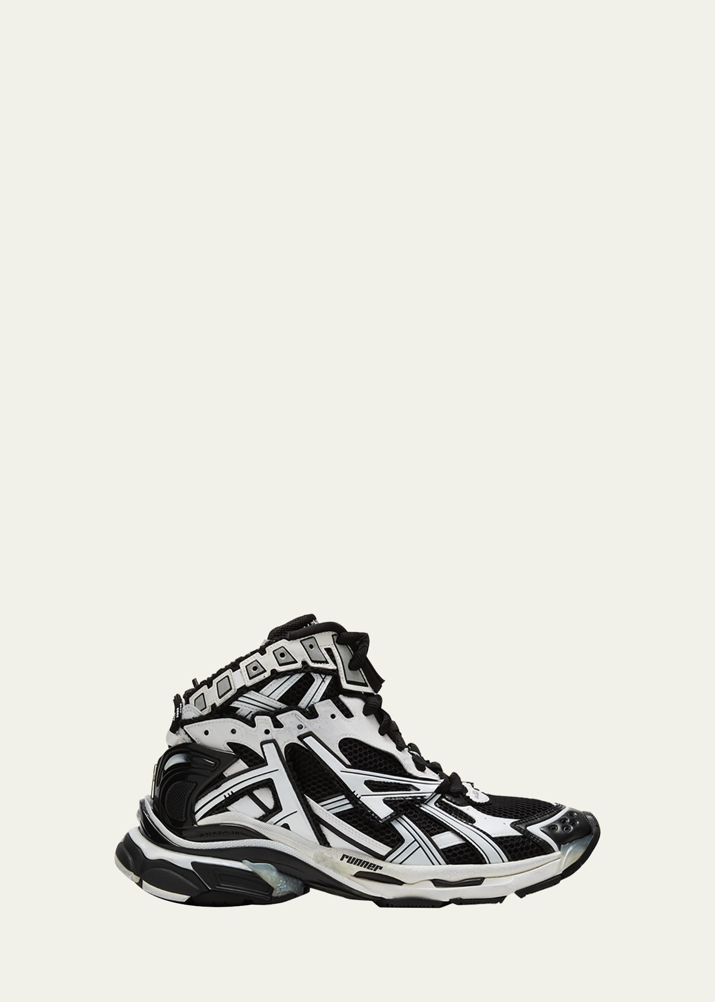 Balenciaga high-top runner sneakers with fabric mesh upper and caged overlays Flat chunky heel Reinforced round toe Logo lettering at toe cap Lace-up vamp Embroidered logo at tongue Padded collar Branding and pull tab at backstay Embossed logo with branded print at side Rubber outsole Made in Italy