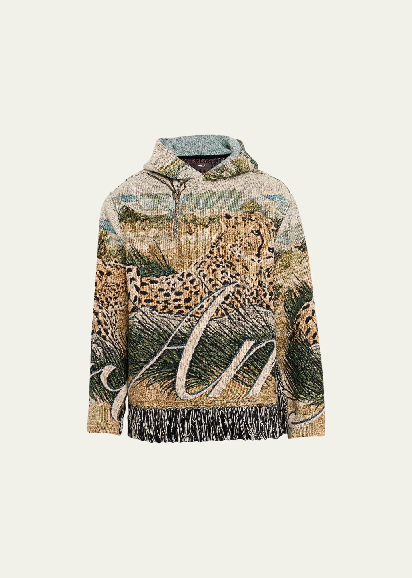 Amiri hoodie in cheetah tapestry fabric Long sleeves Fringe hemline Pullover style Cotton Made in USA from imported materials