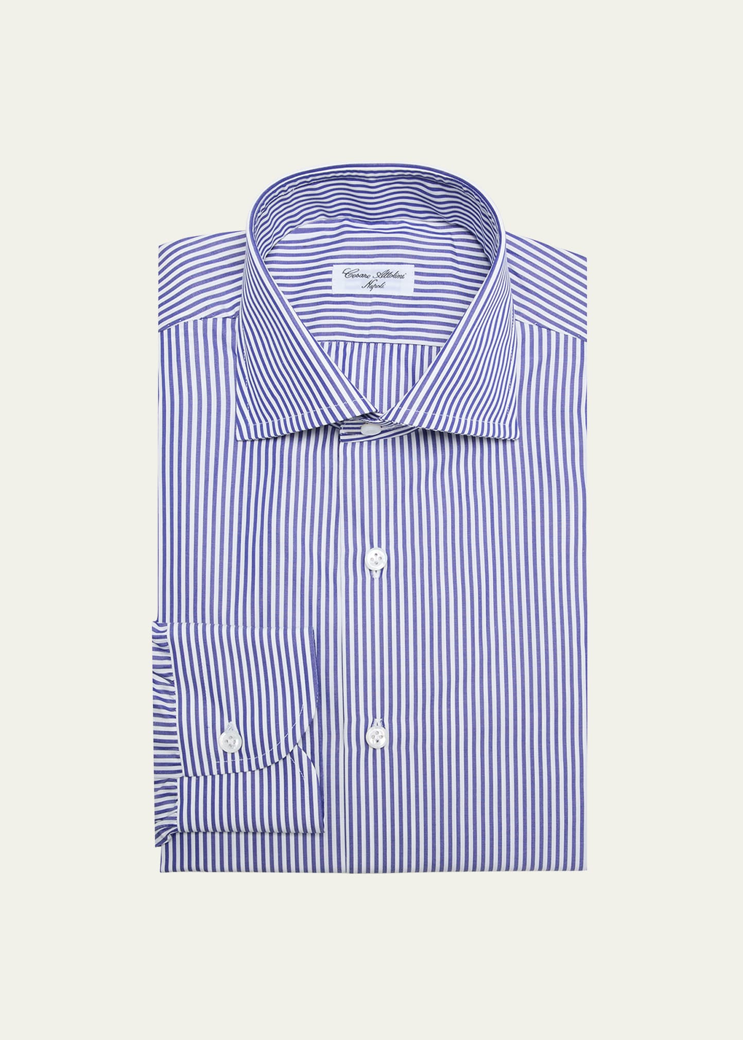 Cesare Attolini dress shirt with an allover pinstripe print Point collar; button placket Long sleeves Round barrel cuffs Yoked back shoulders Shirttail hem Cotton Made in Italy