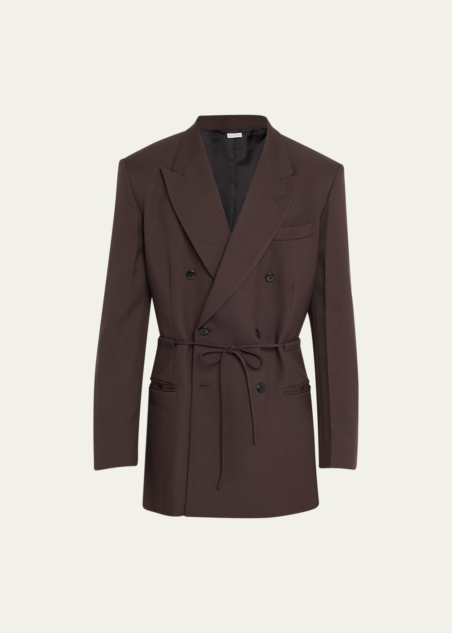 RANDOM IDENTITIES solid blazer with integrated drawstring at waist Peak lapels; double-breasted front Chest welt pocket Jetted hip pockets Unfinished sleeves Polyester/viscose Made in Italy