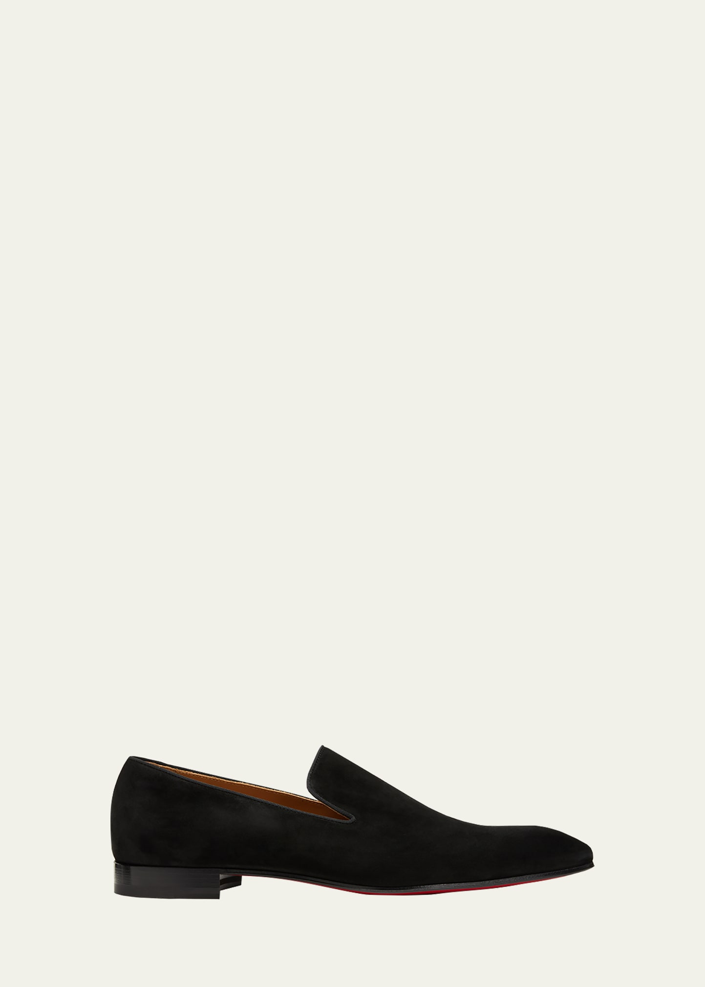 Christian Louboutin "Dandelion" loafers from the Summer 15 collection feature a luxuriously soft velour upper Stacked heel Almond toe Notched vamp Tonal grosgrain trim Slip-on style Signature Louboutin red leather outsole Made in Italy