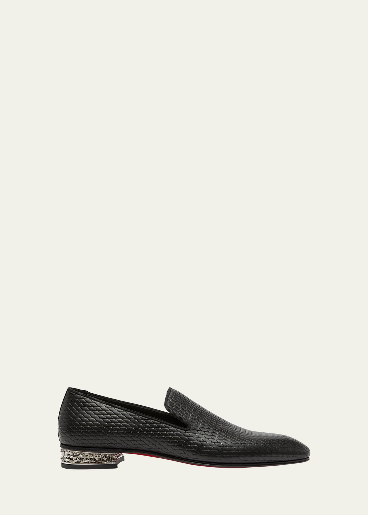 Christian Louboutin "Dandyrocks" loafers in embossed leather Stacked heel features inlaid signature spikes Almond toe Notched vamp Grosgrain trim Slip-on style Signature Louboutin red leather outsole Made in Italy